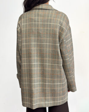 Stylowa marynarka damska w kratę o luźnym fasonie z podszewką i zapięciem na guziki. Idealna do eleganckich i casualowych stylizacji.