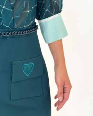 Turkusowa mini sukienka Elisabetta Franchi – Zestaw 2w1. Logowana koszula oraz odpinany dół jako spódnica – kieszenie z łańcuszkami i eleganckie detale w unikalnym stylu.
