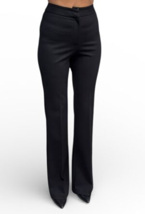 Czarne damskie spodnie z materiału marki Silence z wysokim stanem, dopasowaną górą i delikatnie rozszerzaną nogawką. Eleganckie, wygodne, klasyczne.