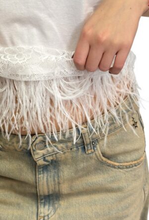 Damska, biała bluzka z koronką i piórami, uszyta w 100% z bawełny. Krótki rękaw, okrągły dekolt i eleganckie detale. Poczuj modny vibe z marką Twinset!