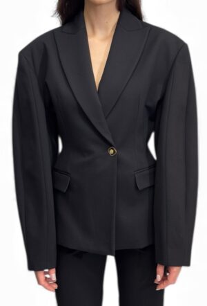 Klasyczna, taliowana, czarna marynarka z balonowymi rękawami od włoskiej marki Silence. Najwyższej jakości materiał, minimalistyczny design – idealna wybór!