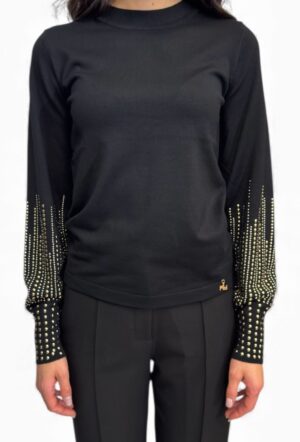 Stylowy, czarny sweter ze złotymi dżetami na rękawach od marki Artigli. Wykonany z miękkiej wiskozy i nylonu. Idealny na wieczorne wyjścia jak i na codzień.