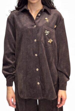 Czekoladowa koszula damska ze sztruksu z broszkami. Elegancka, wygodna i idealna na każdą okazję. Odkryj modny kolor i wyjątkowe detale od marki Pia B!