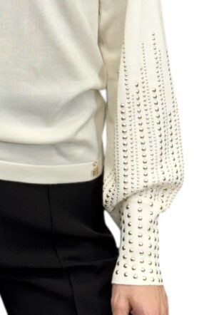 Kremowy sweter ze złotymi dżetami na rękawach. Wykonany z miękkiej wiskoza i trwałego nylonu – elegancki wygląd na codzień oraz na specjalne okazje!