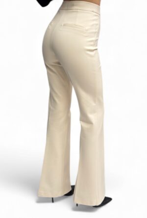 Kremowe damskie spodnie z materiału z wysokim stanem, dopasowaną górą i delikatnie rozszerzaną nogawką. Eleganckie, wygodne, klasyczne od marki Silence!
