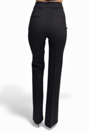 Czarne damskie spodnie z materiału marki Silence z wysokim stanem, dopasowaną górą i delikatnie rozszerzaną nogawką. Eleganckie, wygodne, klasyczne.