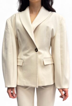Stylowa kremowa marynarka z balonowymi rękawami oraz dopasowaną talią od marki Silence. Idealna do pracy i na wyjątkowe okazje. Postaw na elegancję!