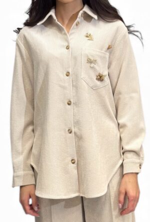 Kremowa koszula damska ze sztruksu marki Pia B ozdobiona złotymi broszkami. Modny wygląd i komfort na codzień i do pracy. Idealna niezależnie od okazji!