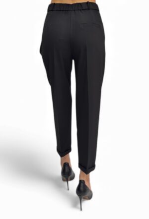 Czarne spodnie z materiału, damskie z wysokim stanem, zakładkami i zwężaną nogawką. Idealne do biura, na spotkania – wygodne, klasyczne od marki Imperial.
