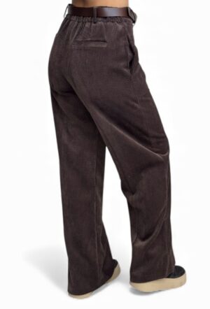 Czekoladowe spodnie damskie ze sztruksu. Szeroka nogawka, wygodny fason i modny kolor. Sprawdź ten wyjątkowy model od włoskiej marki Pia B!