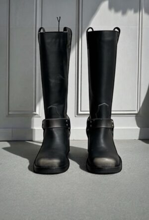 Czarne skórzane kozaki na obcasie włoskiej marki Ovye. Styl biker, solidna podeszwa i modny pasek z klamrą. Ponadczasowy model na jesień i zimę.