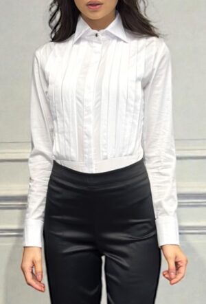 Elegancka biała bluzka damska koszula body z pionowymi plisami marki Revise. Klasyczny krój, idealna do biura i specjalne okazje. Ponadczasowa elegancja.