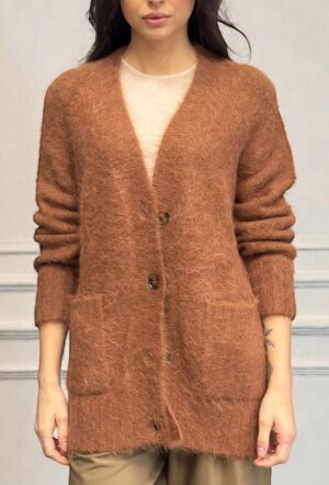 Stylowy brązowy sweter kardigan z alpaką od marki Mos Mosh. Miękki, ciepły, zapinany na guziki. Idealny do sukienek i jeansów na chłodniejsze dni.