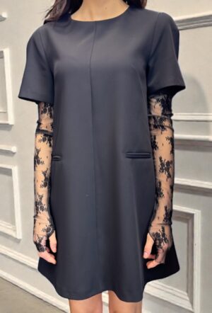 Czarna sukienka z krótkim rękawem marki Imperial. W zestawie odpinany długi rękaw z koronki utrzymujący się dzięki silikonowi. Elegancja i nowoczesność.