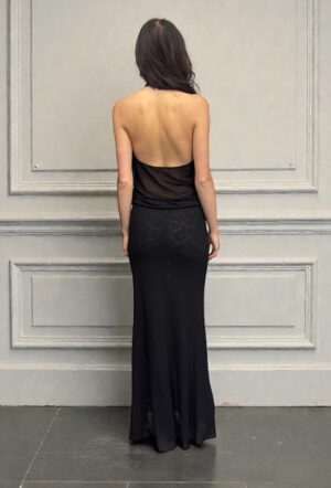 Długa czarna elegancka sukienka z koronką i zmysłowym rozcięciem od marki Cristinaeffe. Na wesele, bal i wieczorne wyjścia. Kobiecy krój i luksusowy styl.