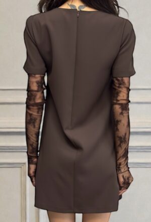 Elegancka czekoladowa sukienka z rękawem z koronki marki Imperial. Odpinany koronkowy rękaw z silikonowym wykończeniem pozwala tworzyć różne stylizacje.