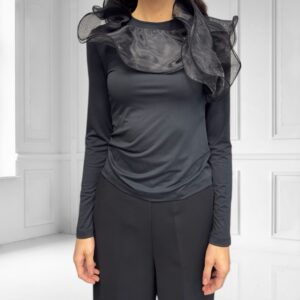 Efektowna czarna bluzka z długim rękawem i falbaną przy dekolcie od marki Imperial. Idealna do biura i na wyjątkowe okazje – włoska jakość premium!