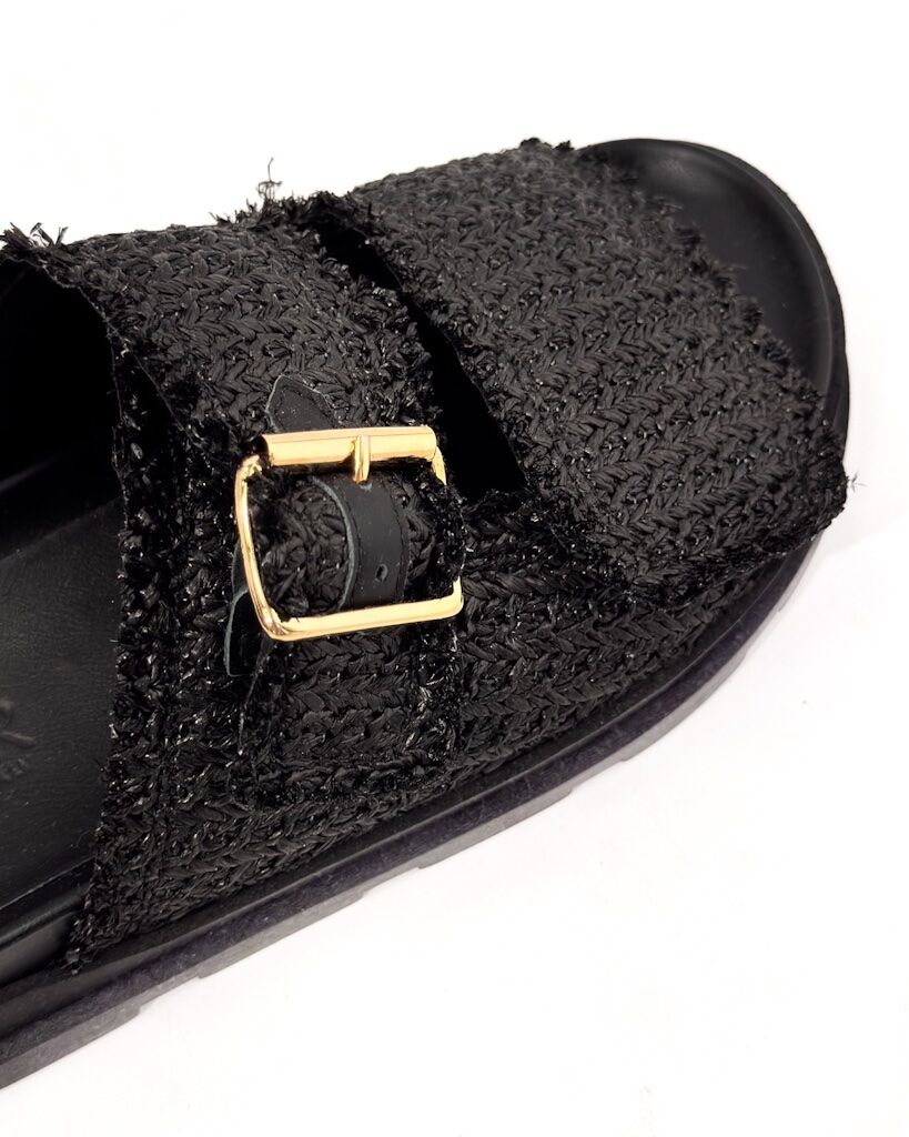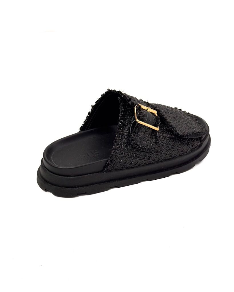 Opis: Góra wykonana al’a przędza boucle, złote zapięcie, podeszwa wykonana z wysokogatunkowego tworzywa