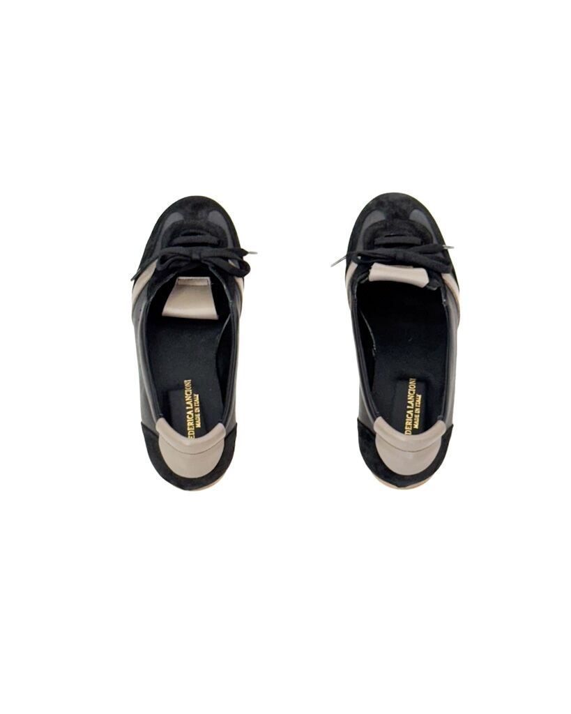 Czarne, skórzane sportowe baleriny damskie z beżowym akcentem. Lekkie, wygodne, z ozdobnym sznurowaniem, wykonane ze skóry naturalnej i zamszu.
