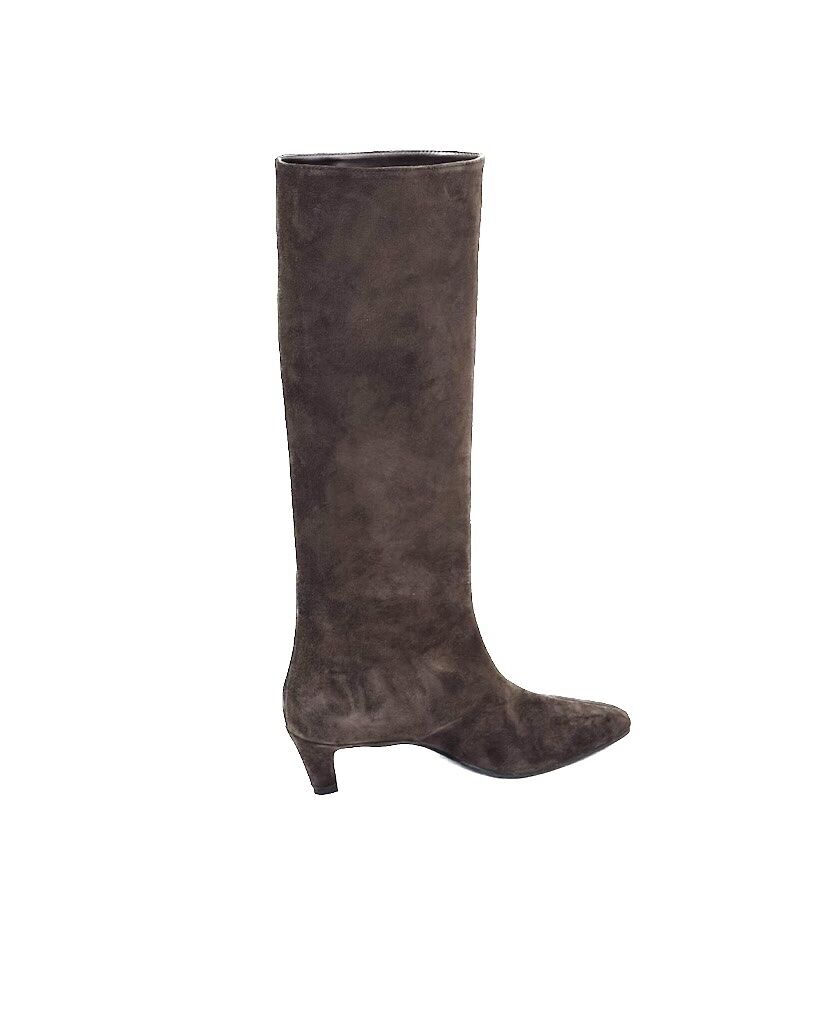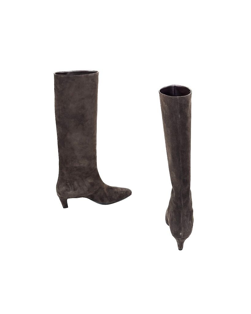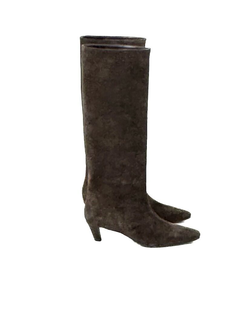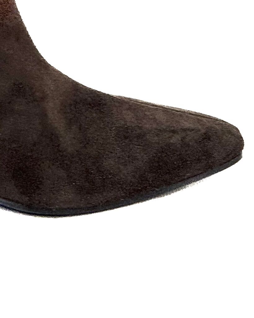 Zamszowe kozaki w kolorze czekoladowym z noskiem w szpic i ozdobnym przeszyciem. Stabilny obcas 5 cm – styl i wygoda na co dzień i na wieczór.