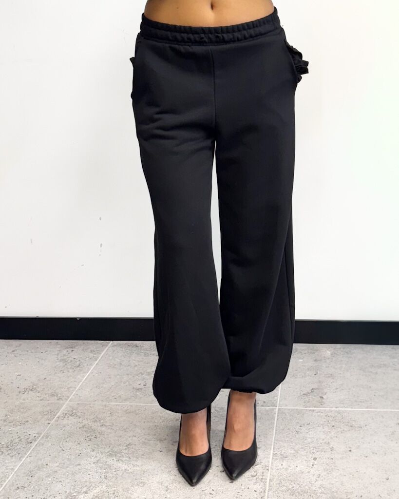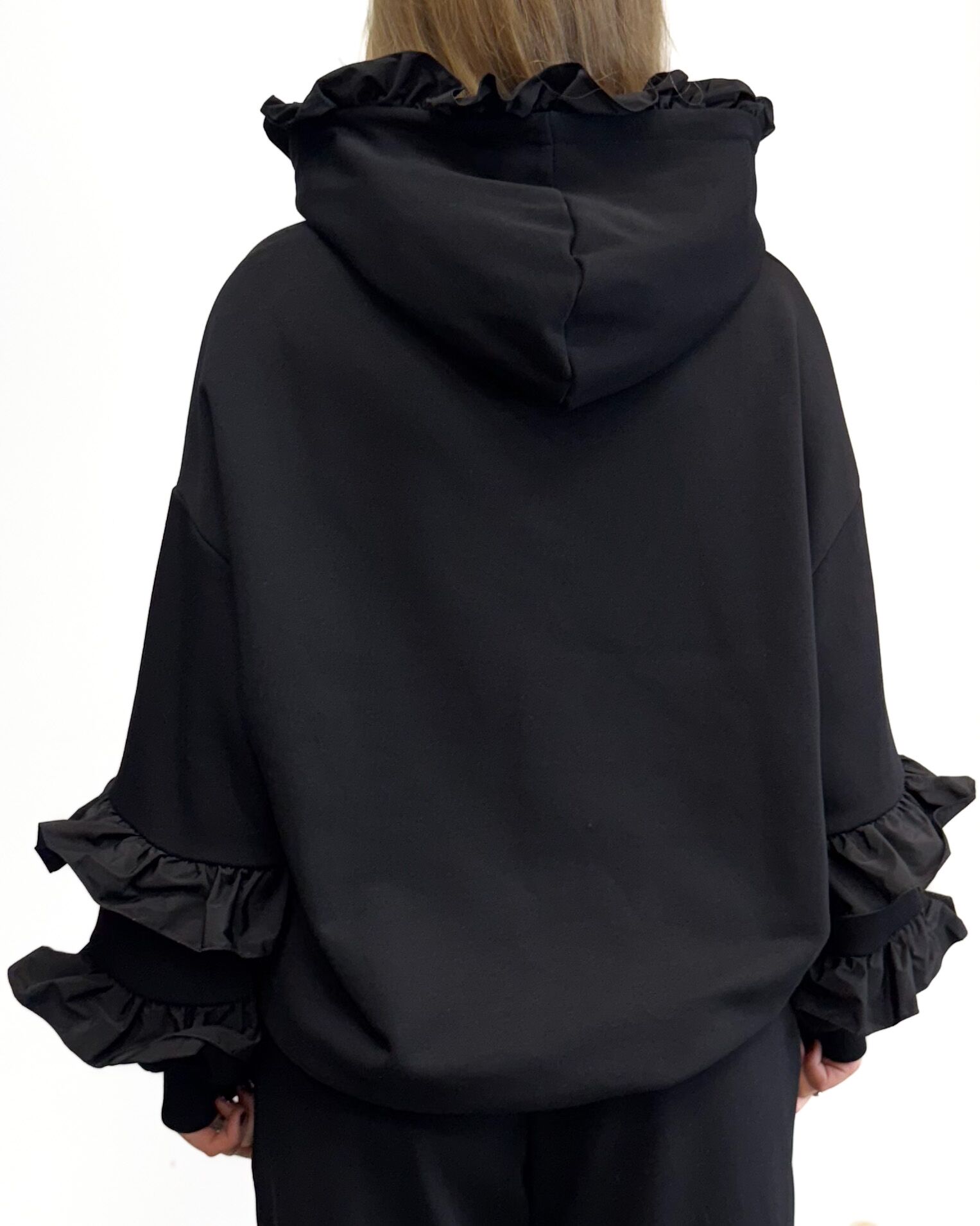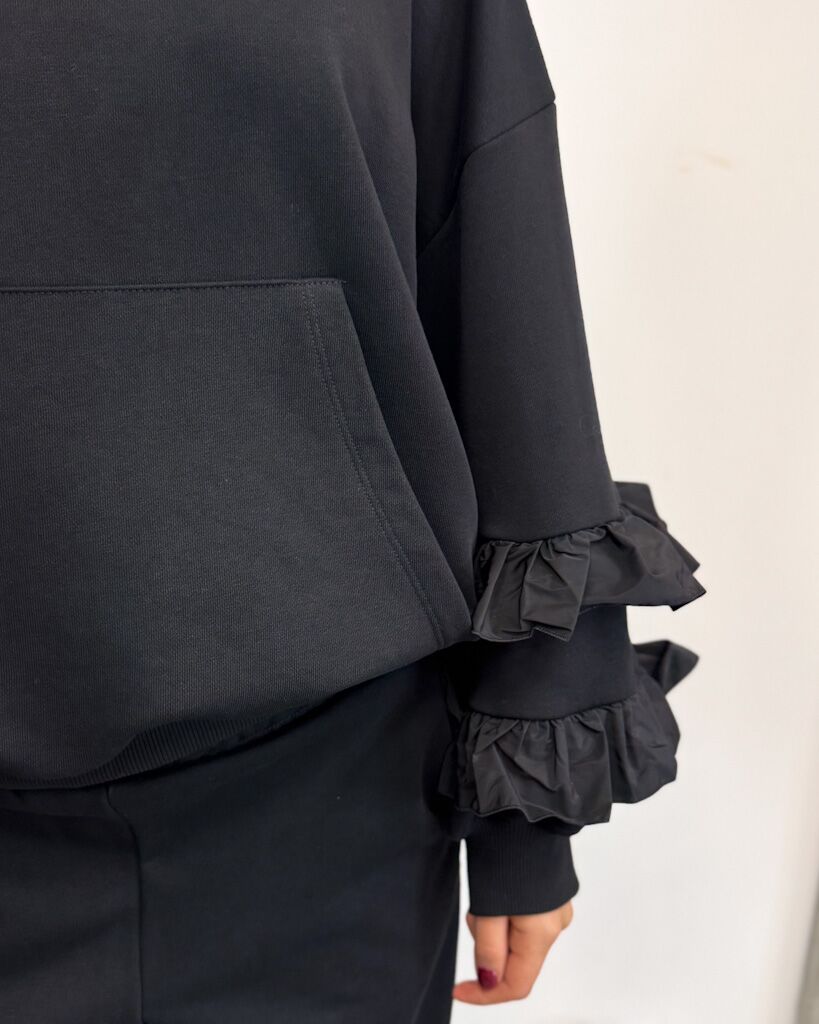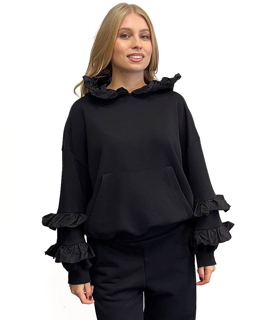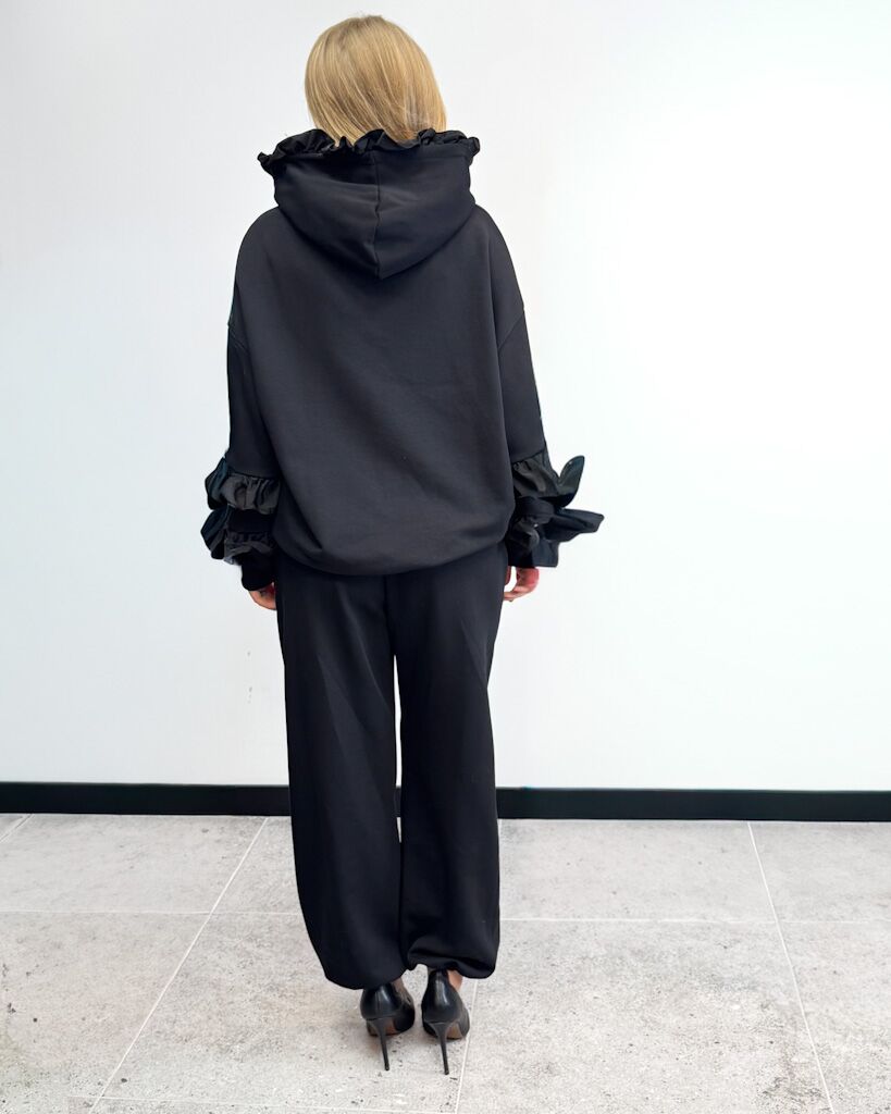 Czarny komplet dresowy z falbankami – luźne spodnie z gumką i bluza z kapturem. Wygodny, stylowy i kobiecy. Idealny na co dzień jak i na wyjazd.
