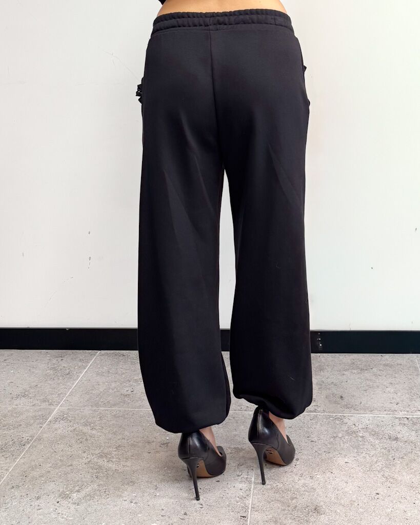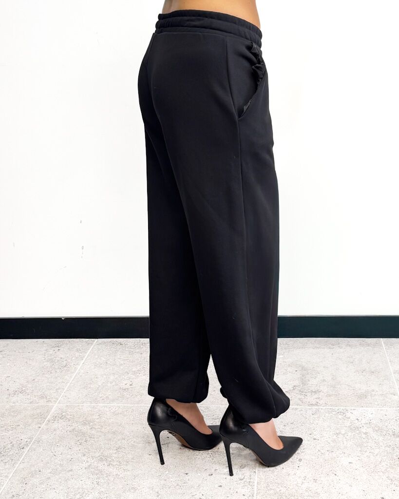 Opis spodni: Luźny fason, ściągacz w pasie, nogawka zakończona gumką, falbanka przy kieszeniach