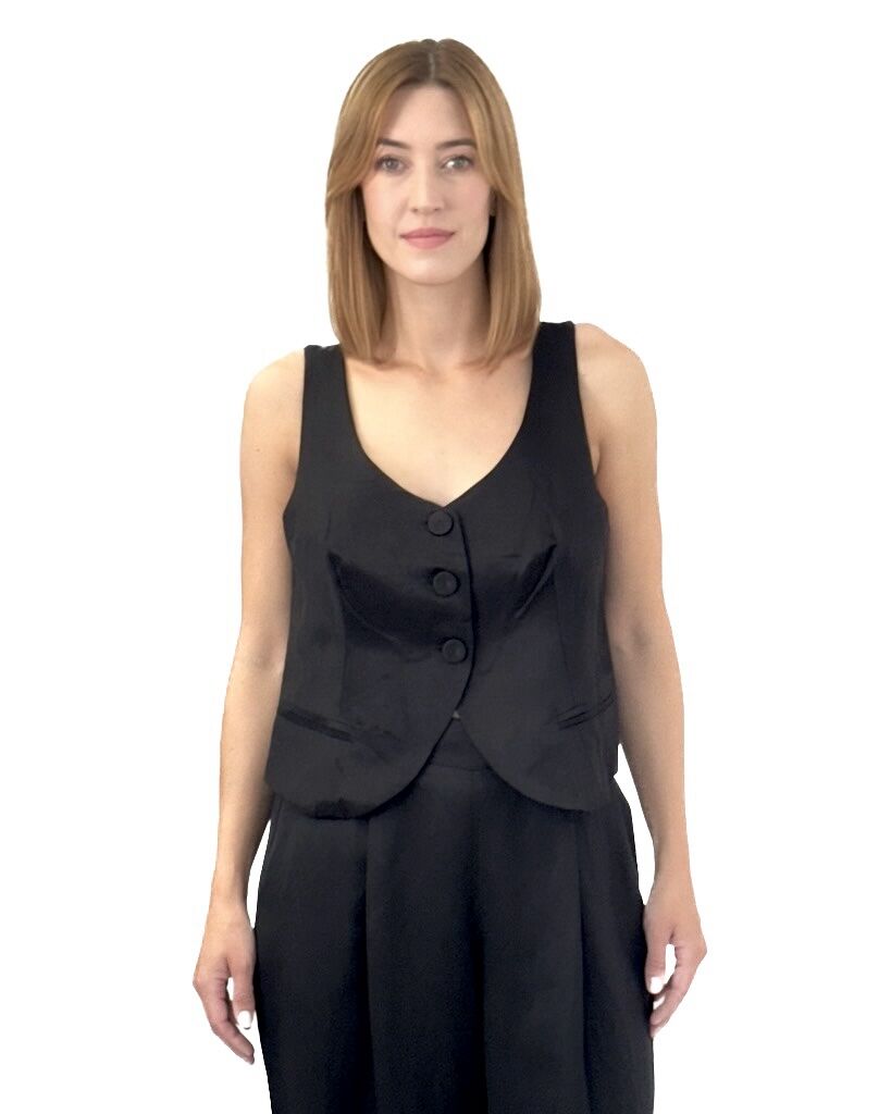 Czarna dopasowana kamizelka na guziki z elegancką podszewką z mieniącego się materiału. Stylowa i kobieca – idealna do eleganckich stylizacji.