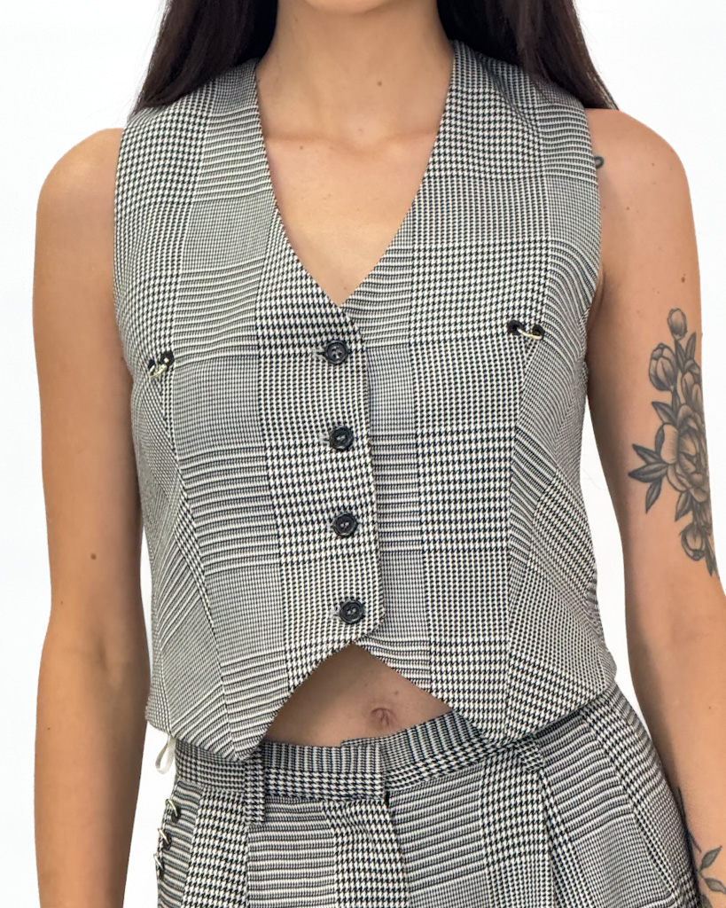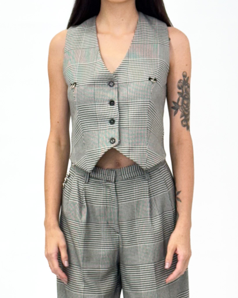 Dopasowana, damska kamizelka w pepitkę z materiału. Zapinana na guziki, idealna do kompletu z marynarką i spodniami. Styl, klasa i wygoda w jednym!