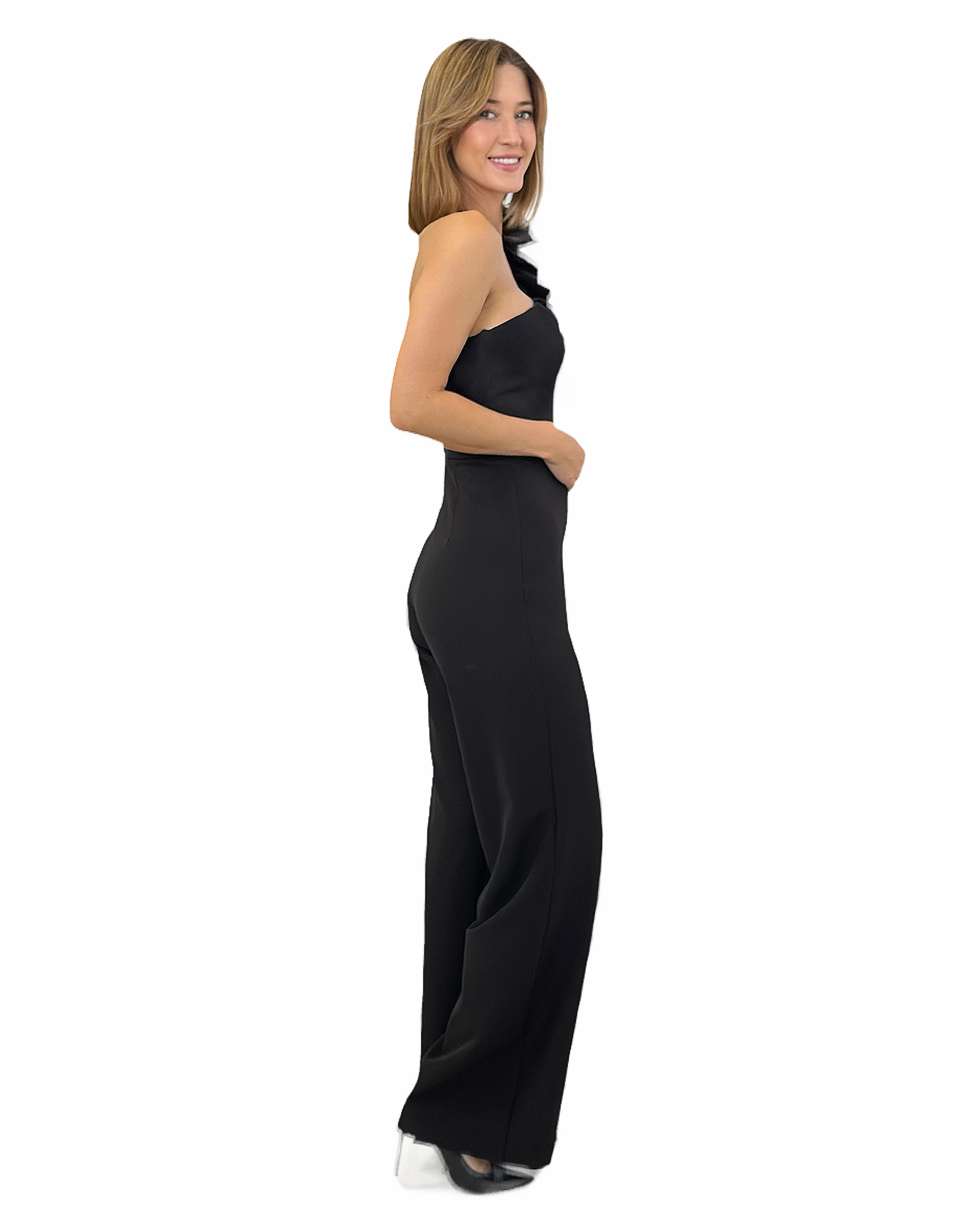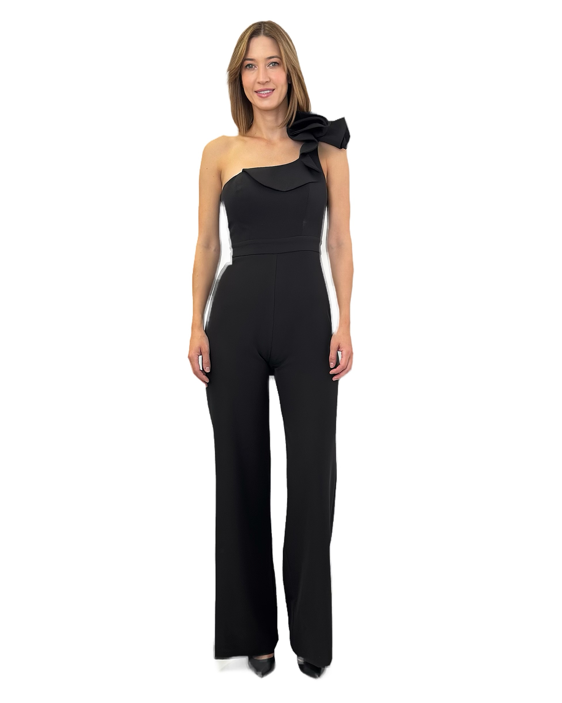 Czarny dopasowany kombinezon na jedno ramię z ozdobną falbanką to połączenie klasyki i nowoczesnej elegancji. Olśniewaj w wyjątkowym stylu!