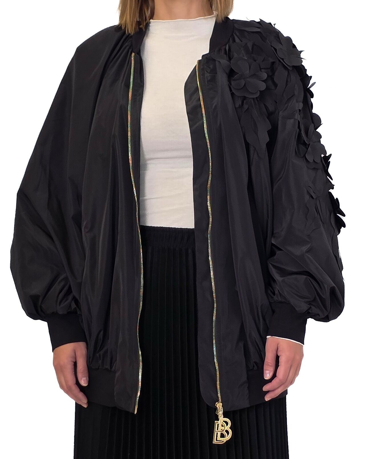 Czarna, kurtka bomberka marki Babylon, o luźnym kroju zapinana na złoty suwak z kwiatowymi zdobieniami. Modna, lekka i stylowa kurtka przejściowa, jesienna.