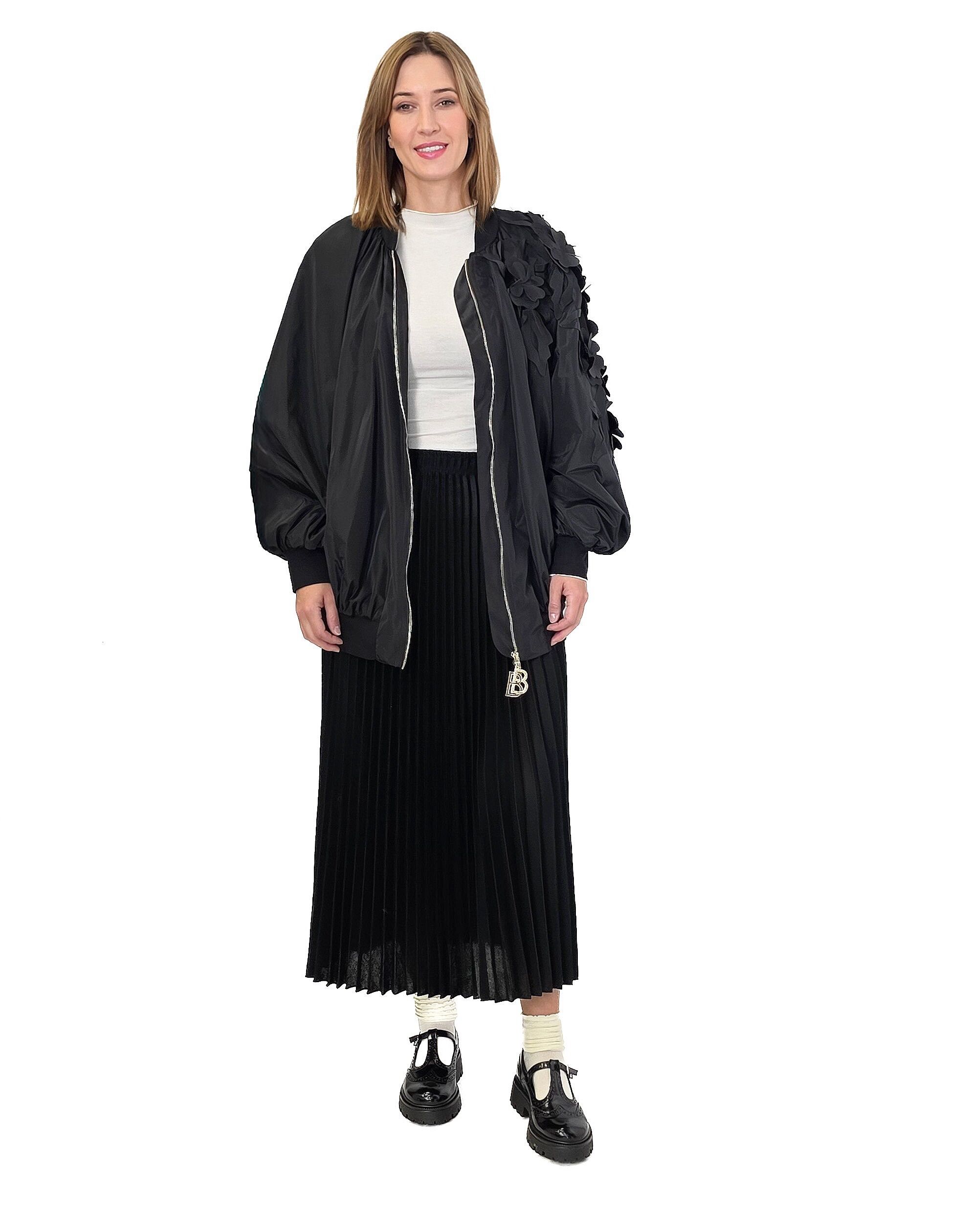 Czarna kurtka bomberka włoskiej marki Babylon o luźnym kroju to must-have w garderobie każdej kobiety ceniącej styl i wygodę. Zapinana na praktyczny suwak w kolorze złotym, doskonale łączy komfort noszenia z modnym designem. Ozdobne kwiatowe detale nadają jej kobiecego i wyjątkowego charakteru, dzięki czemu klasyczna bomberka zyskuje oryginalny, świeży wygląd. Luźny krój zapewnia swobodę ruchów i wygodę noszenia przez cały dzień, a przy tym pasuje do różnych typów sylwetki. Uniwersalny czarny kolor sprawia, że kurtkę łatwo dopasować do wielu stylizacji – świetnie prezentuje się zarówno z jeansami i t-shirtem, jak i ze spódnicą czy eleganckimi spodniami.