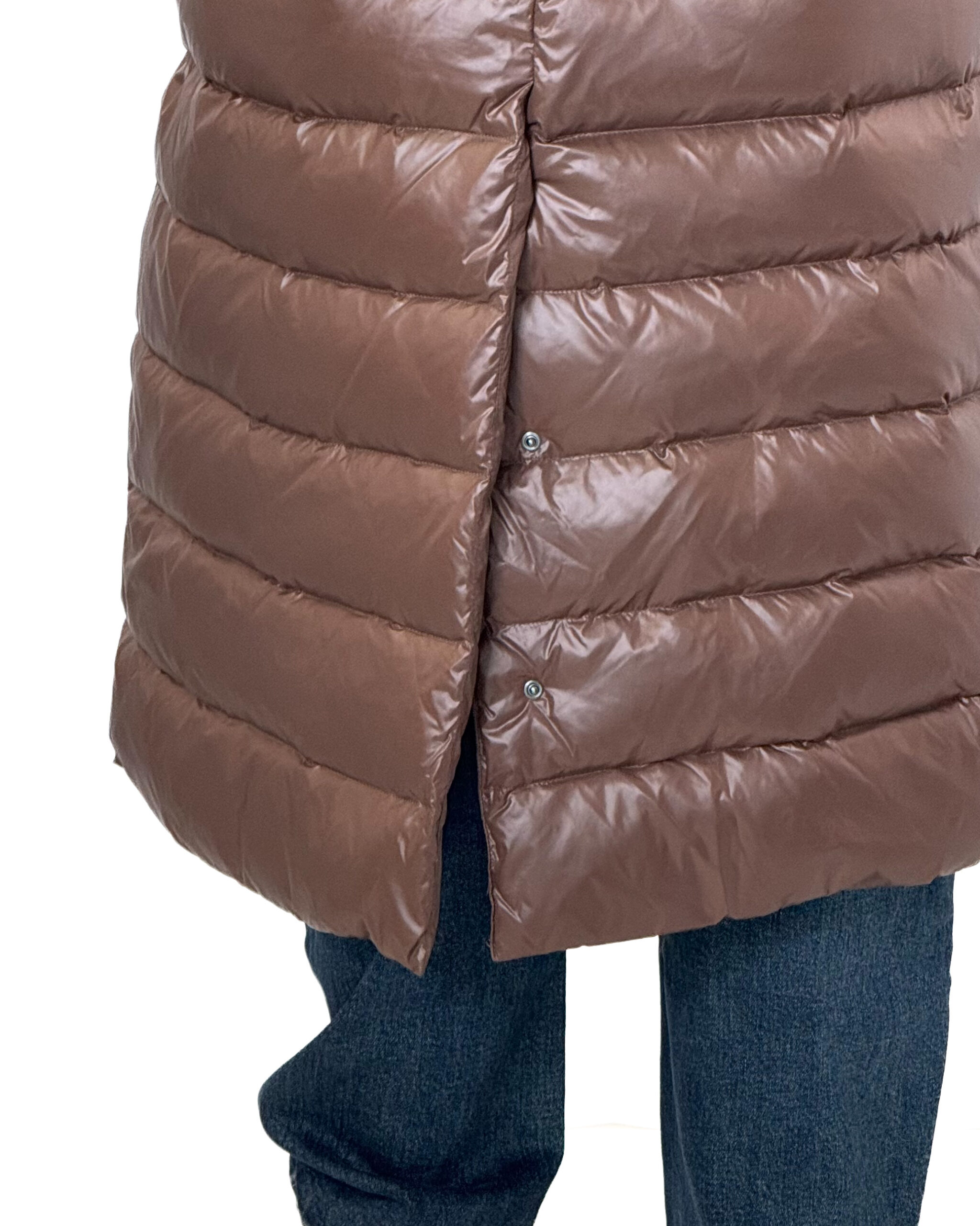 Stylowa, czekoladowa, długa pikowana kurtka damska – lekka, wygodna, zapinana na napy. Kobiecy fason idealny na jesiennie i zimowe dni.