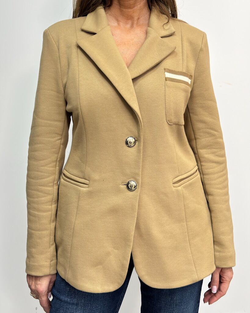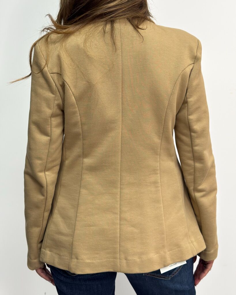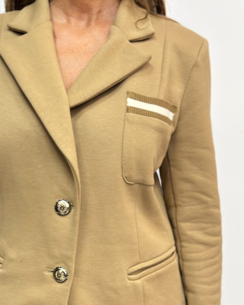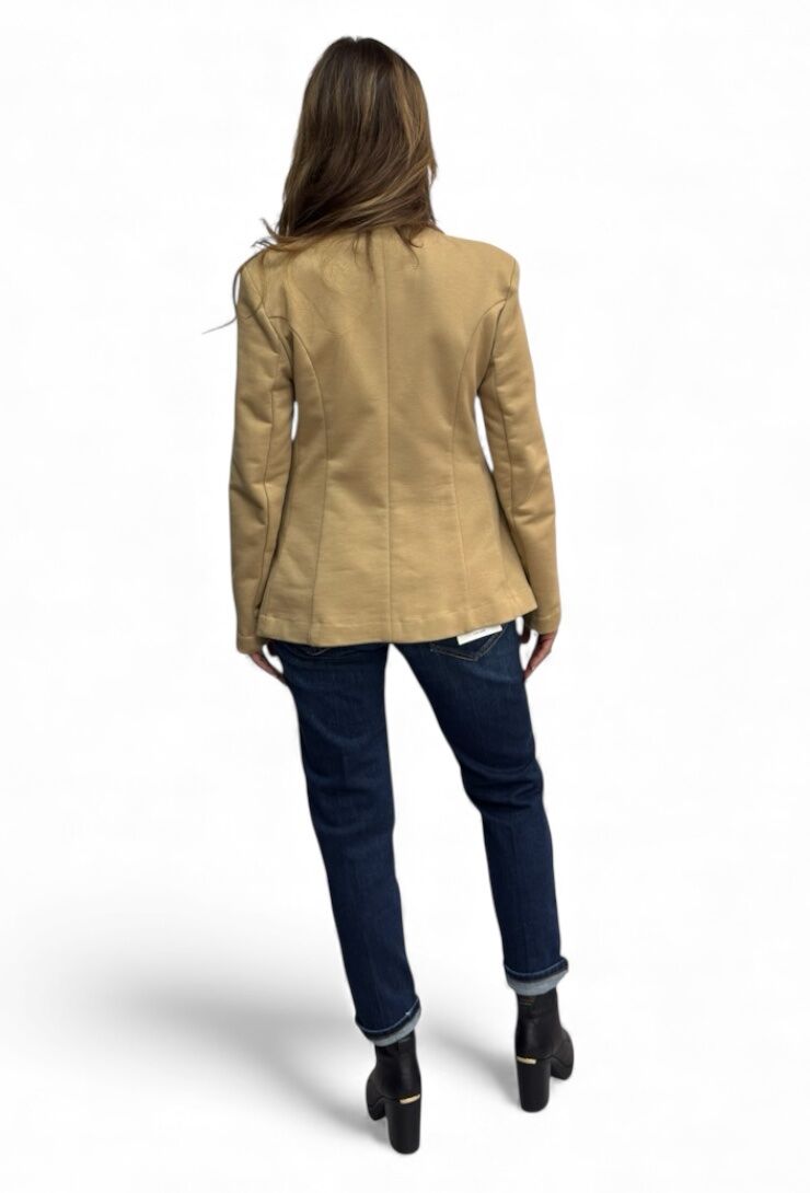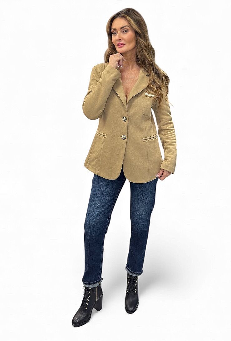 Marynarka zapinana jest na ozdobne guziki, które dodają elegancji i szyku. Delikatny odcień camelu sprawia, że model ten doskonale komponuje się z wieloma stylizacjami – zarówno codziennymi, jak i biznesowymi czy wieczorowymi. Stylowe kieszenie oraz subtelny detal przy piersi nadają jej modnego, a zarazem ponadczasowego charakteru.