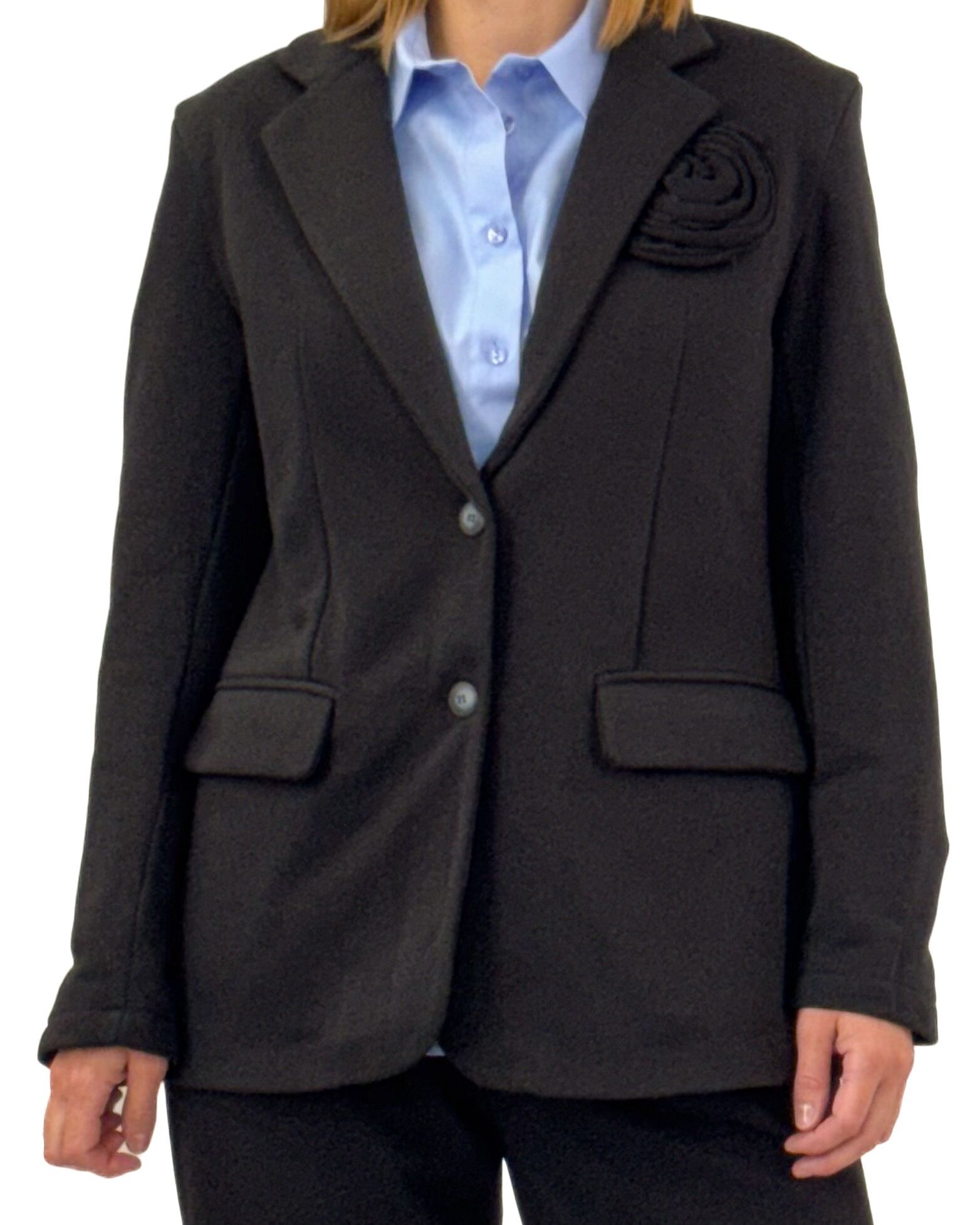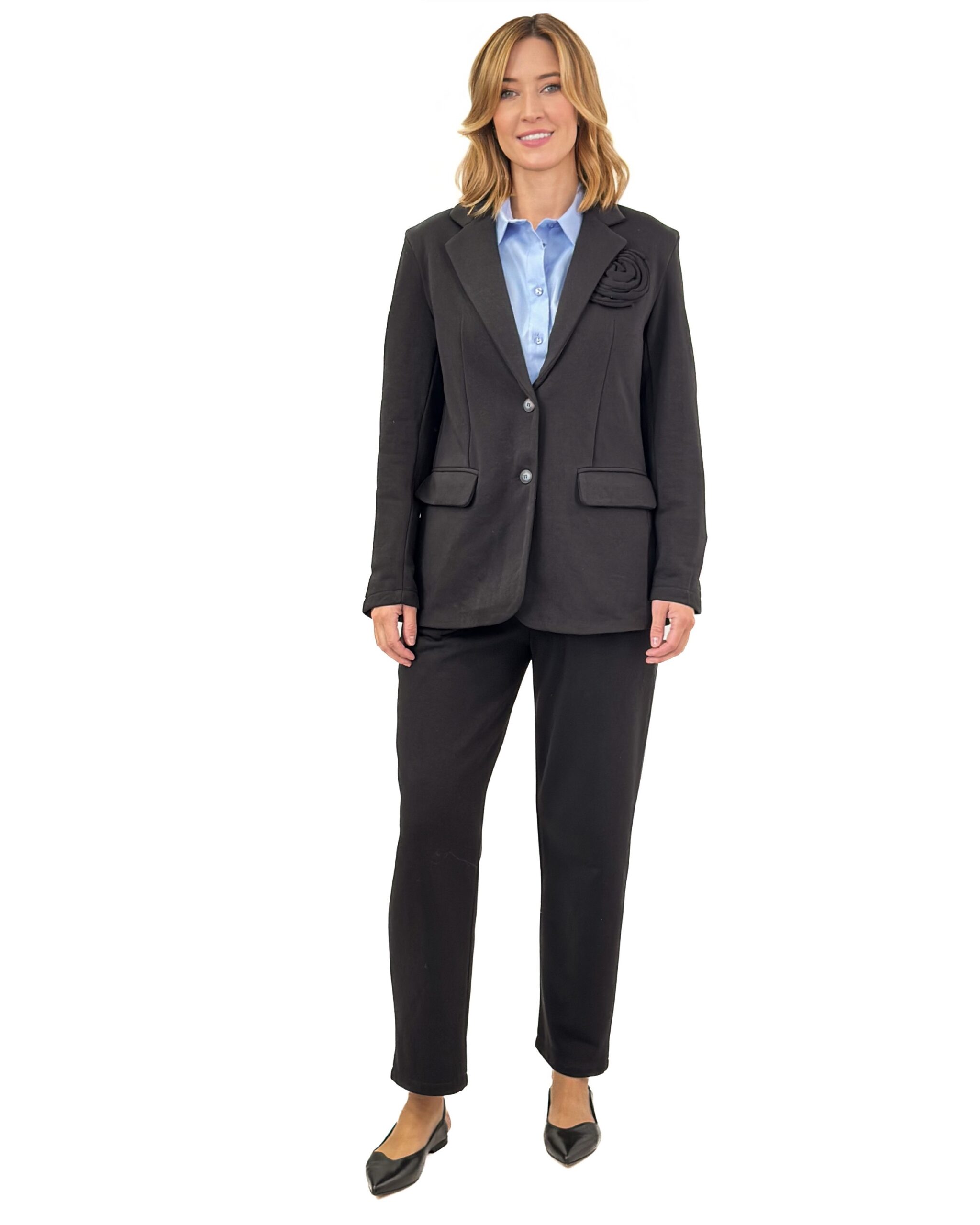Czarna dresowa marynarka o luźnym kroju z ozdobną aplikacją. Zapinana na dwa guziki, z praktycznymi kieszeniami. Styl i wygoda na co dzień.