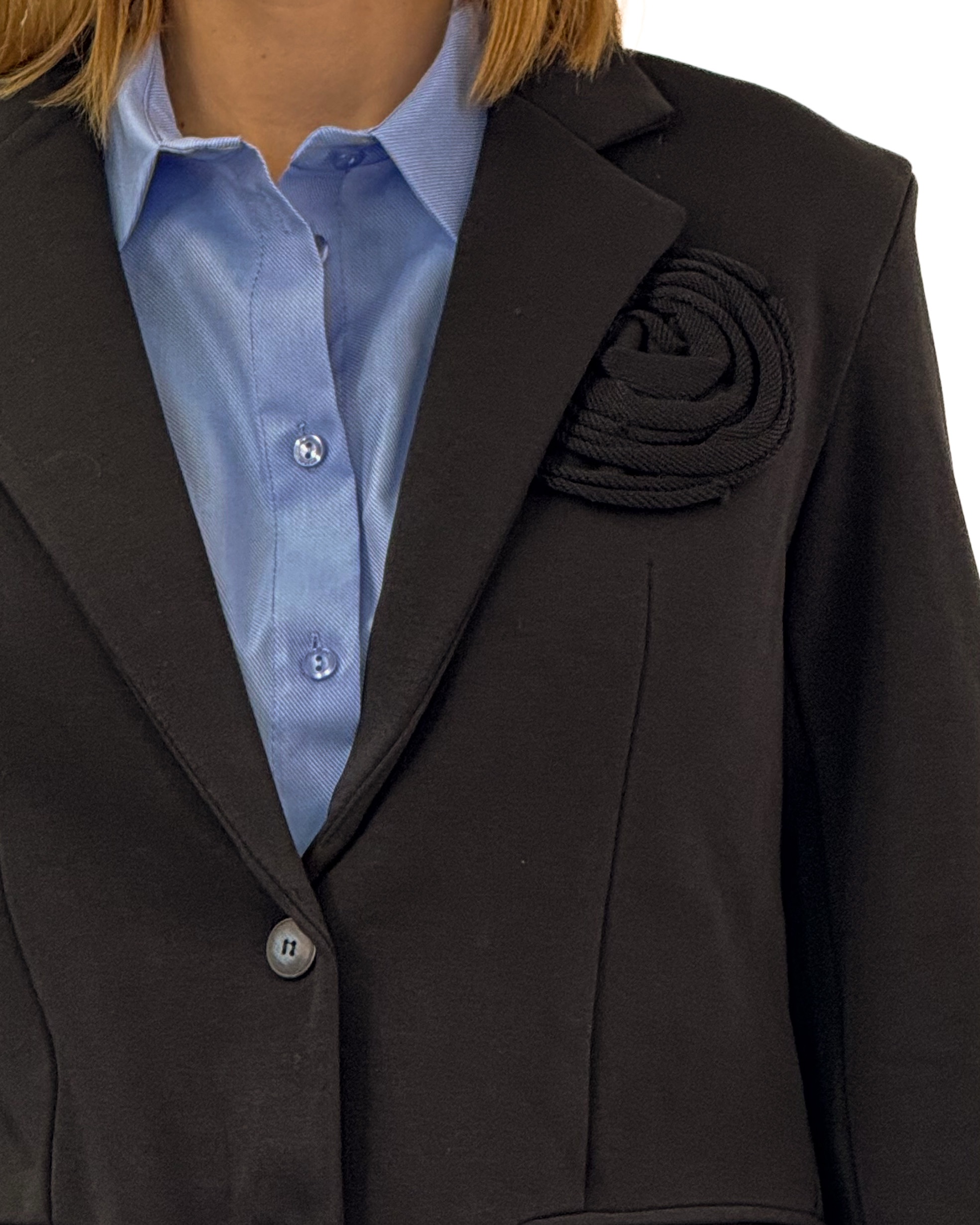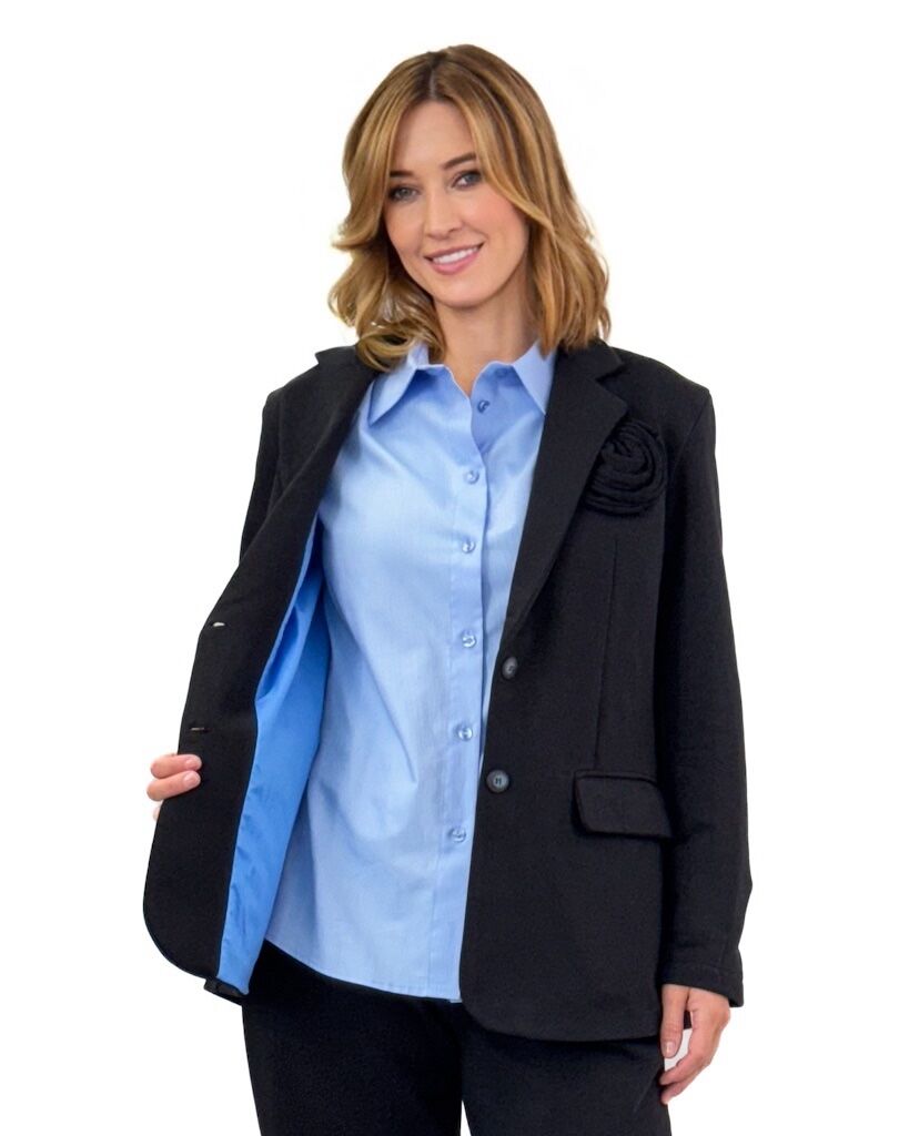 Ozdobna aplikacja na piersi i kontrastowa niebieska podszewka nadają stylizacji wyjątkowego charakteru, dzięki czemu marynarka doskonale sprawdzi się zarówno na co dzień, jak i na mniej formalne spotkania.