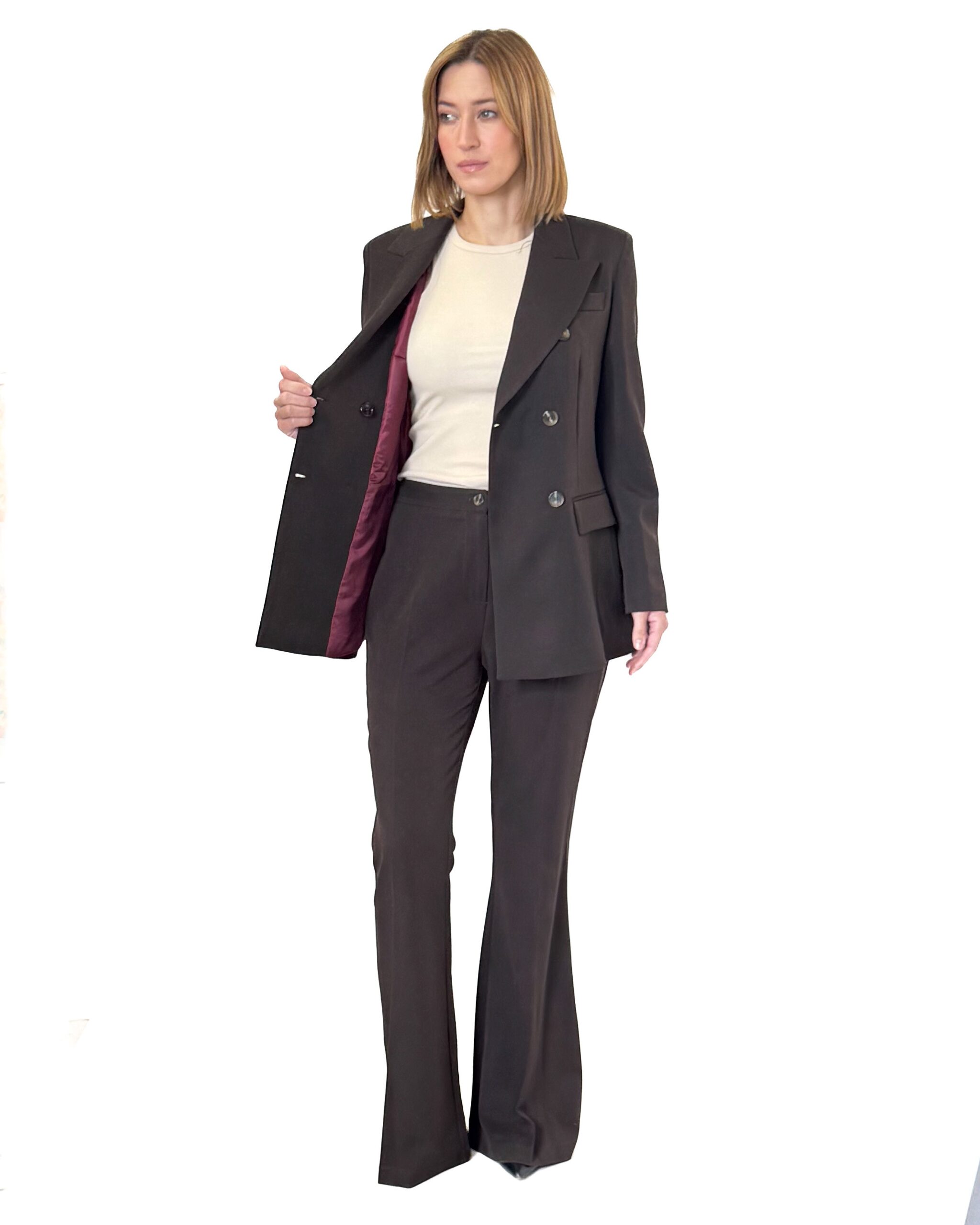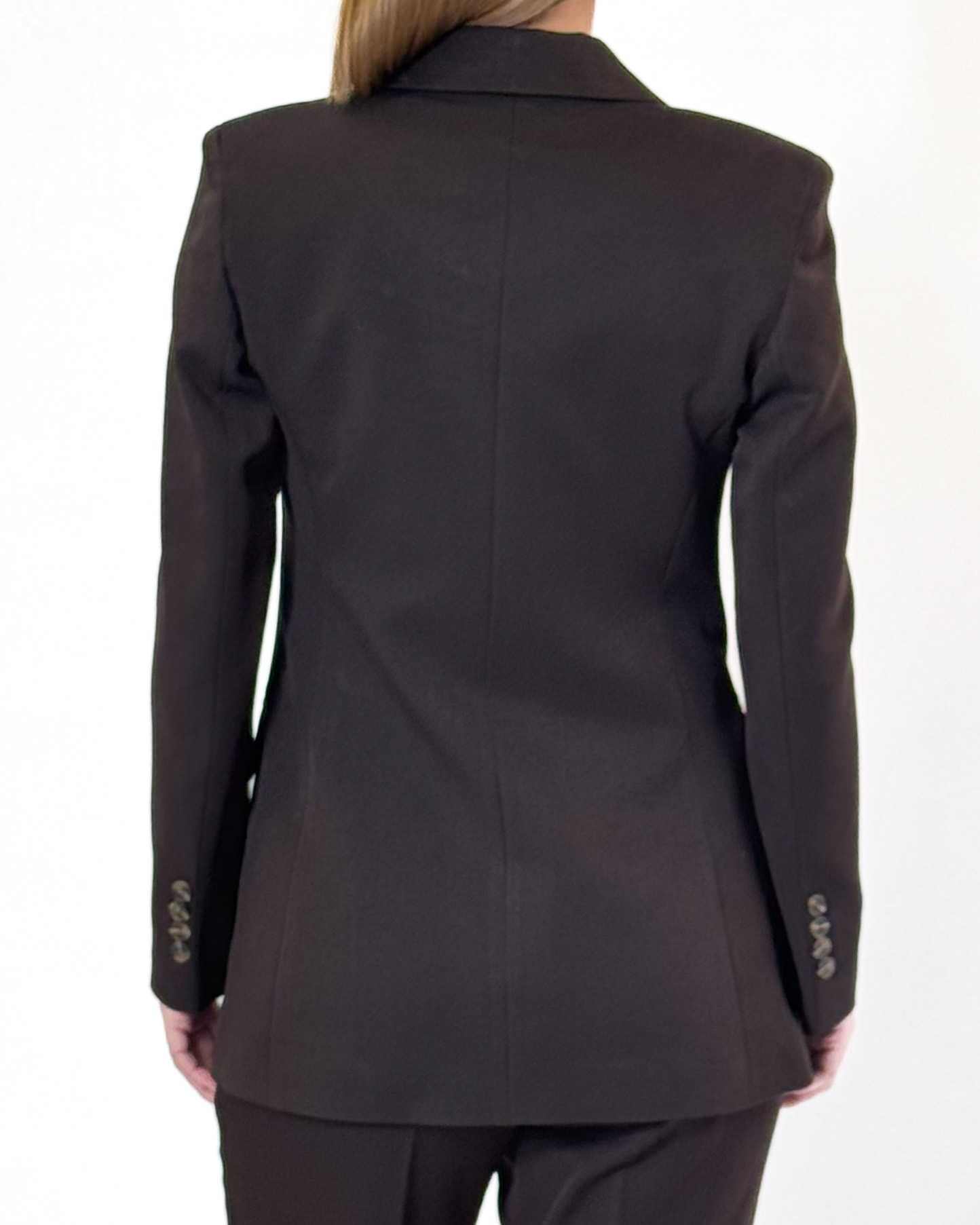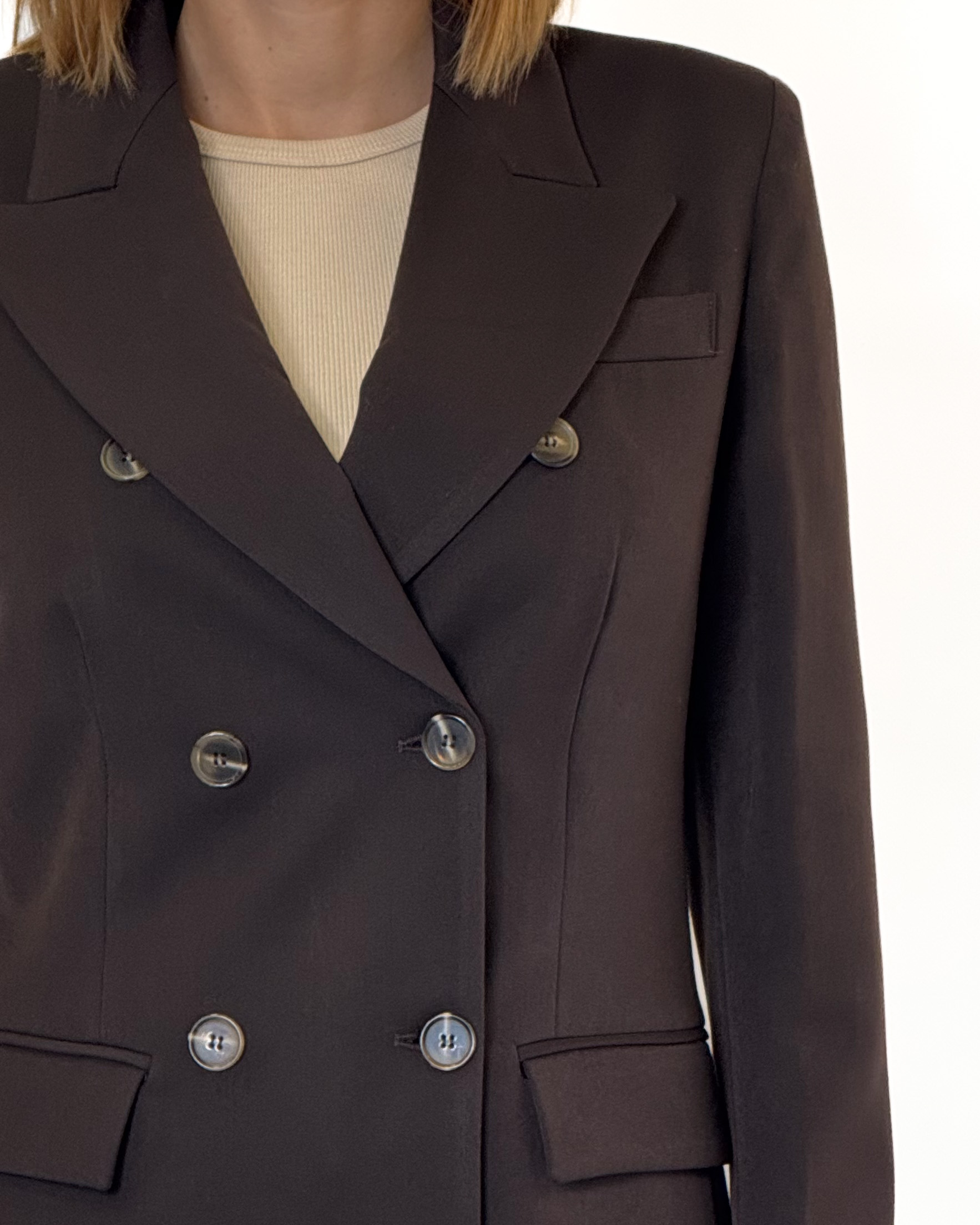 Dwurzędowa, taliowana, czekoladowa marynarka damska marki Artigli. Elegancka, zapinana na guziki – idealna do pracy i codziennych stylizacji.