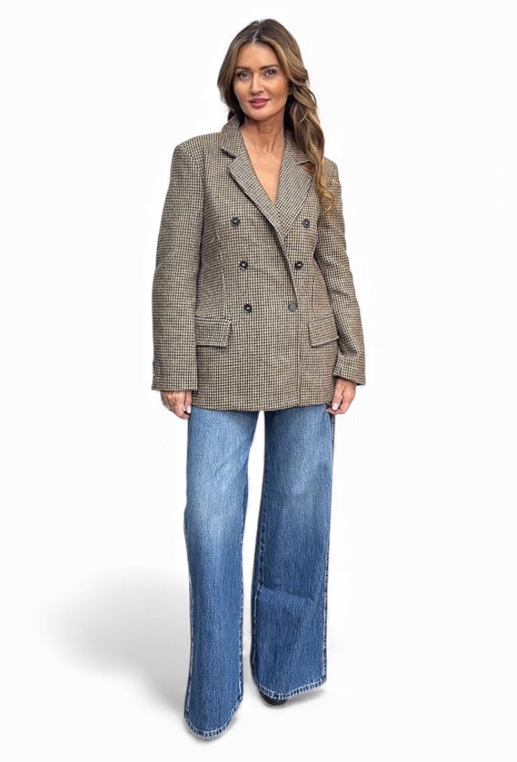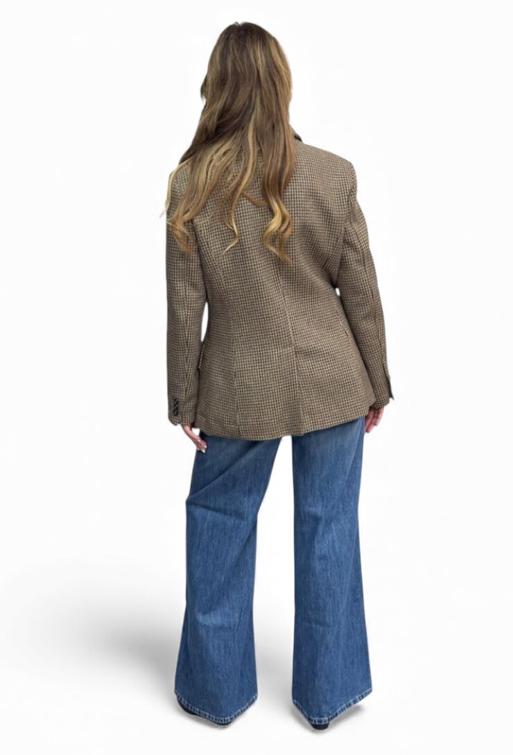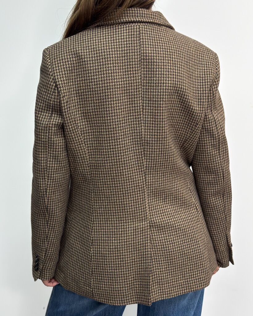 Damska marynarka w pepitkę w odcieniach brązu. Lekko taliowany fason, długość za biodra, zapinana na guziki. Idealna na Jesień do pracy, na codzień.
