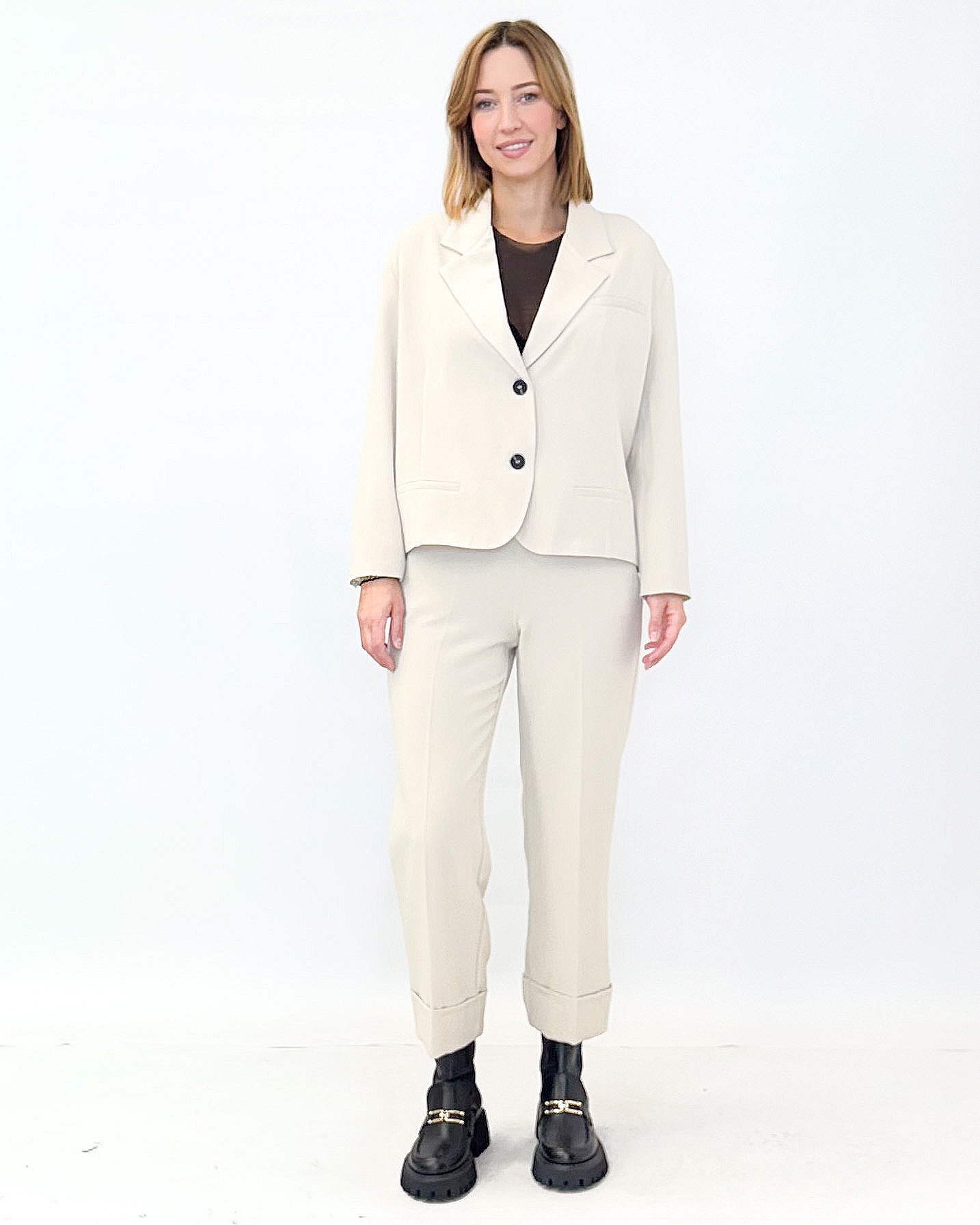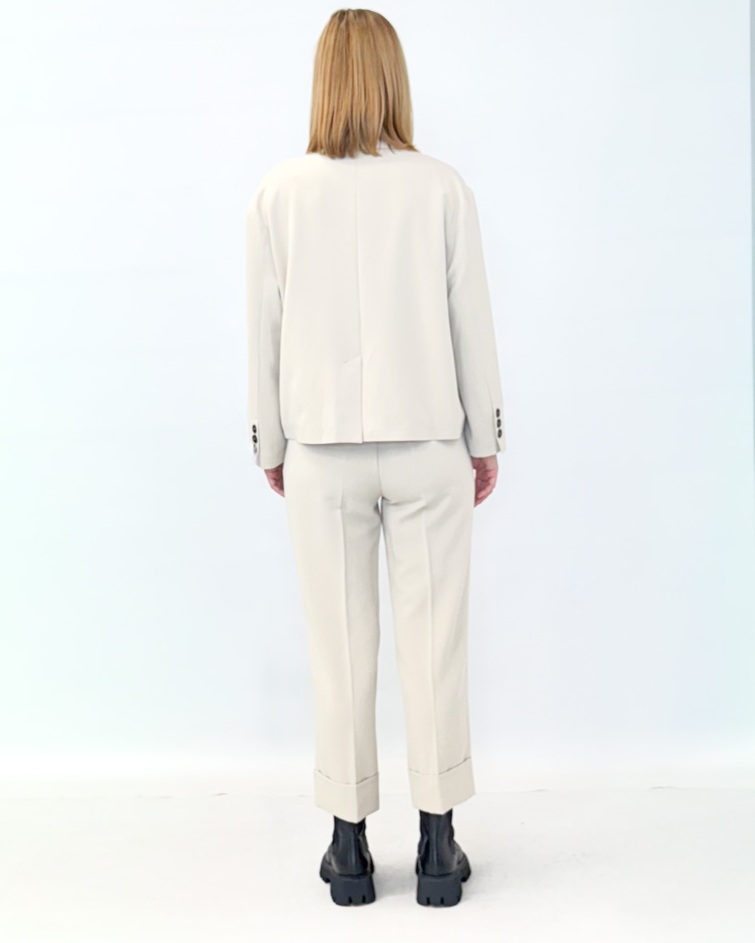 Luźny krój sprawia, że marynarka idealnie komponuje się zarówno z eleganckimi, jak i casualowymi stylizacjami. Klasyczne guziki dodają subtelnego uroku i podkreślają ponadczasowy charakter modelu. Kremowy kolor zapewnia uniwersalność – łatwo zestawić ją z innymi elementami garderoby, takimi jak spodnie, spódnice czy sukienki w różnych odcieniach.