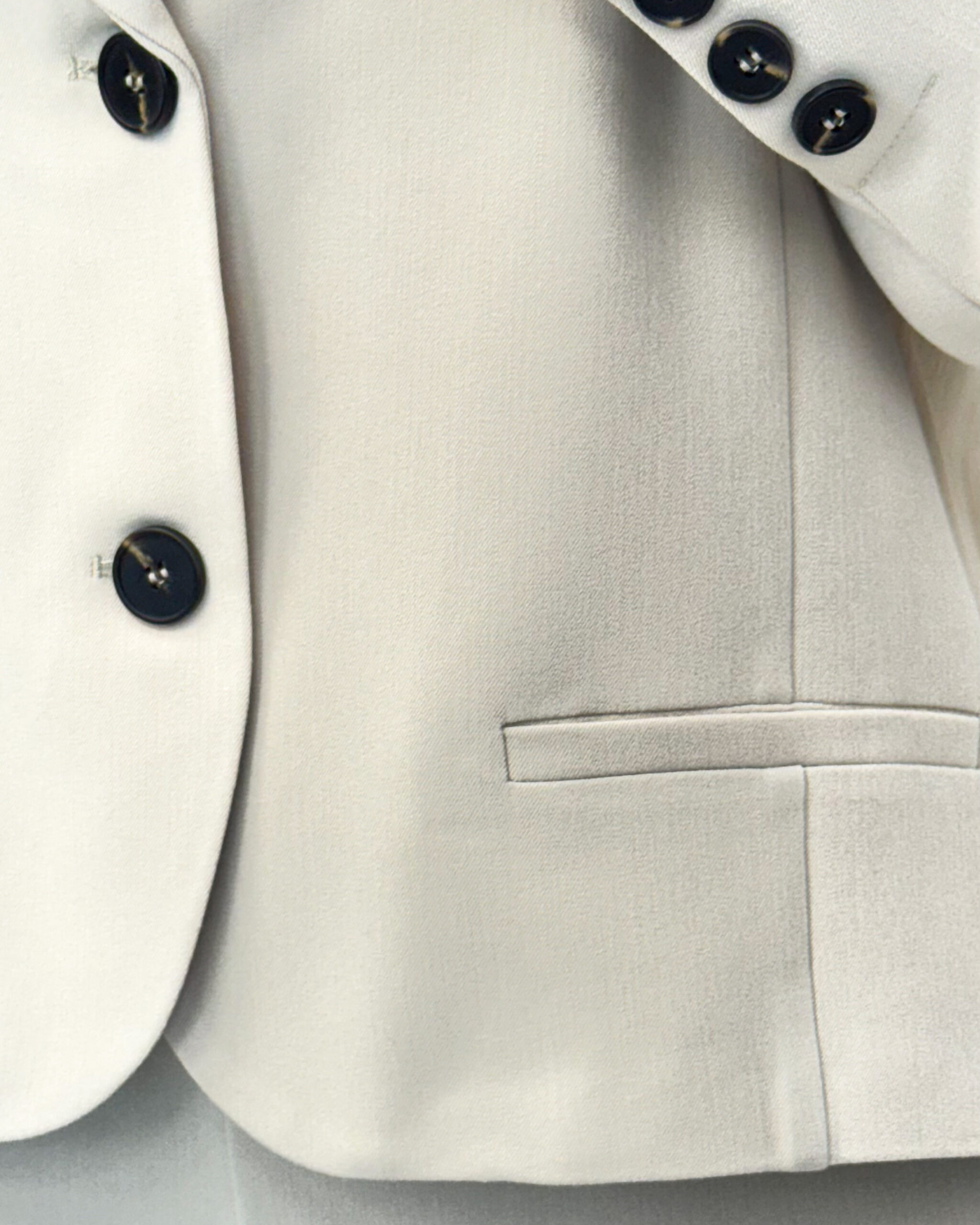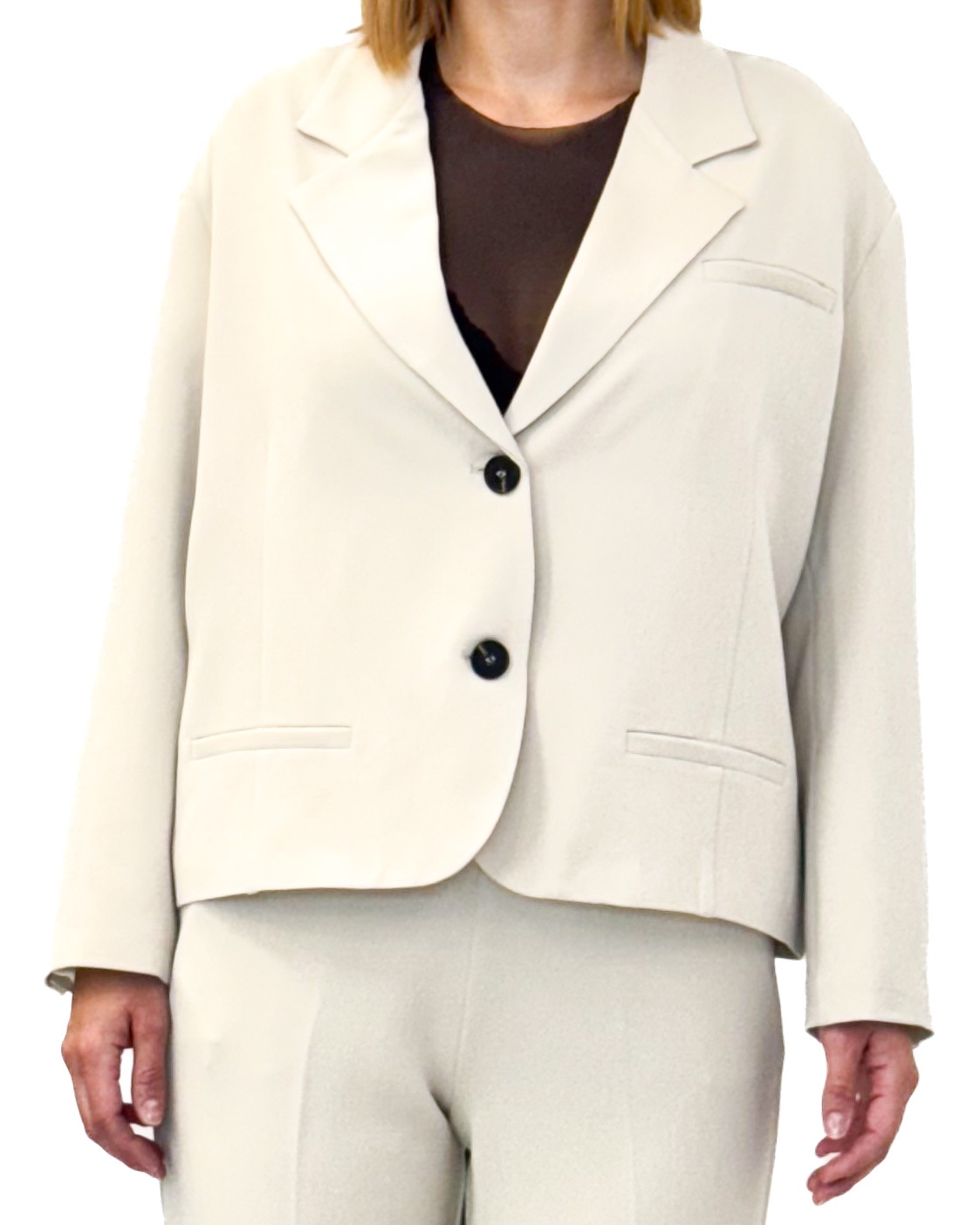 Kremowa marynarka damska o luźnym kroju, zapinana na guziki. Elegancka, uniwersalna i wygodna – idealna na codzienne i formalne stylizacje!