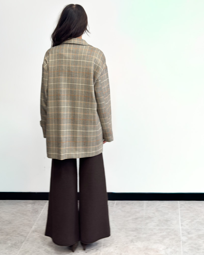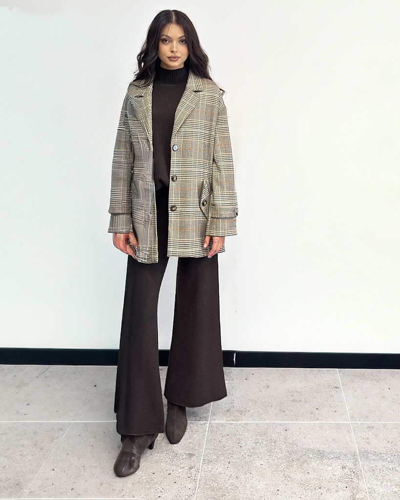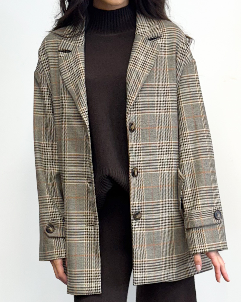 Stylowa marynarka damska w kratę o luźnym fasonie z podszewką i zapięciem na guziki. Idealna do eleganckich i casualowych stylizacji.