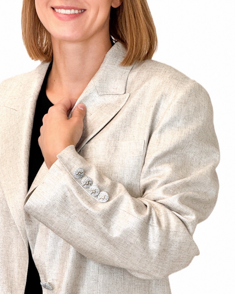 Opis: Luźny krój, obszyte srebrną, mieniącą się nitką, zapinana na jeden guziki, rękawy ozdobione guzikami
