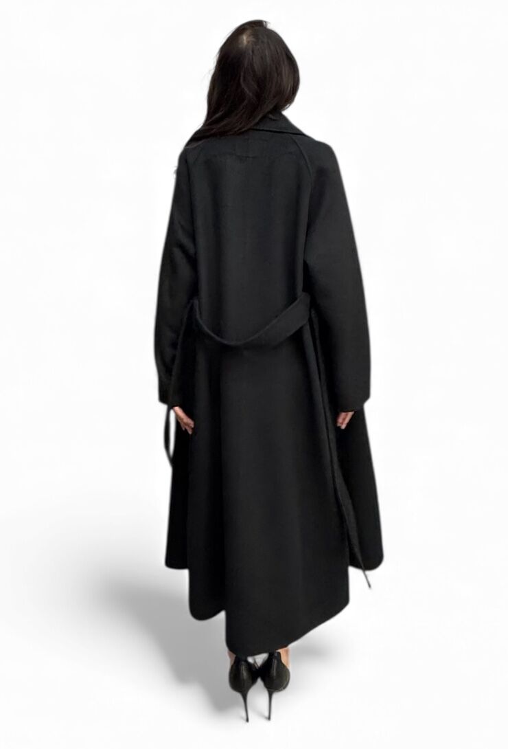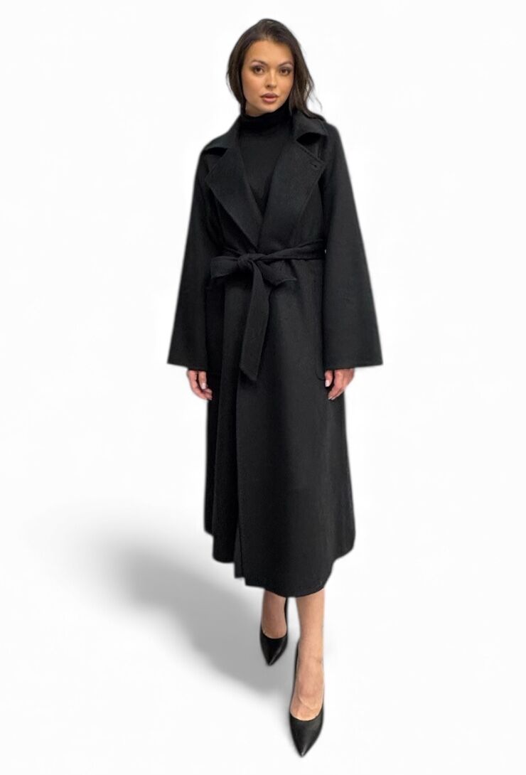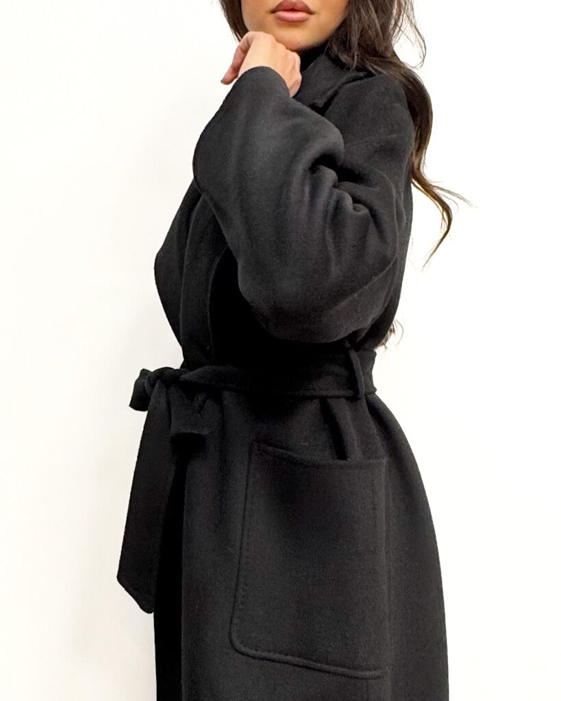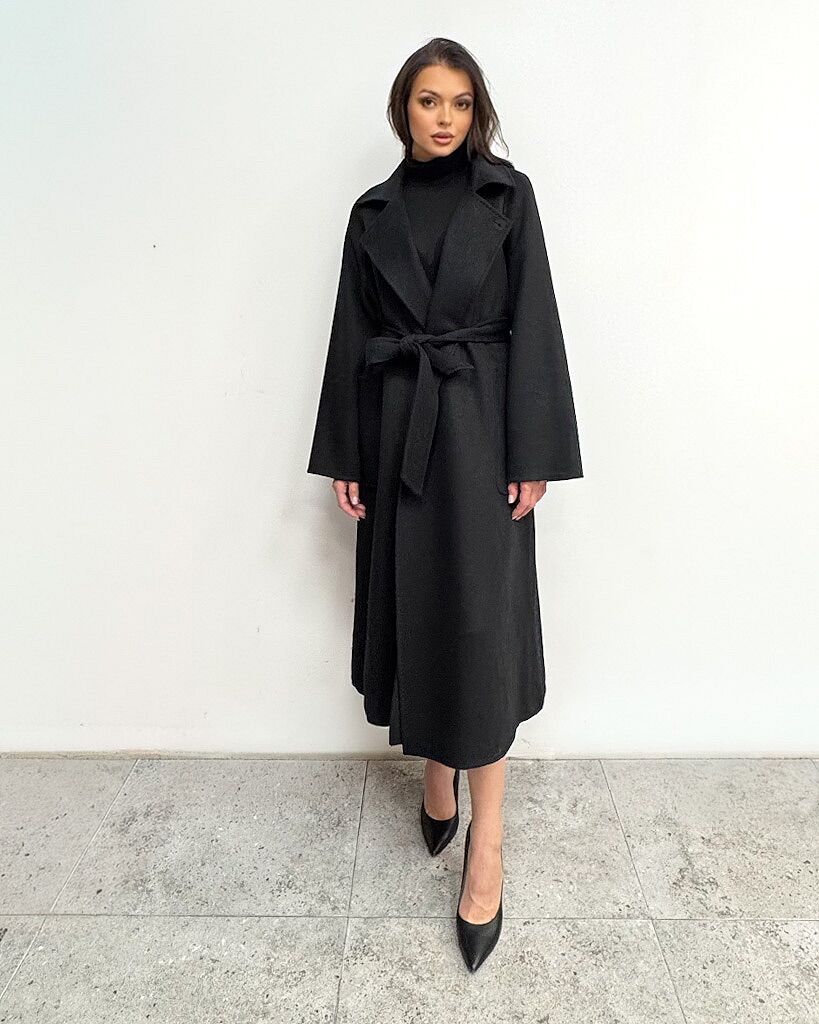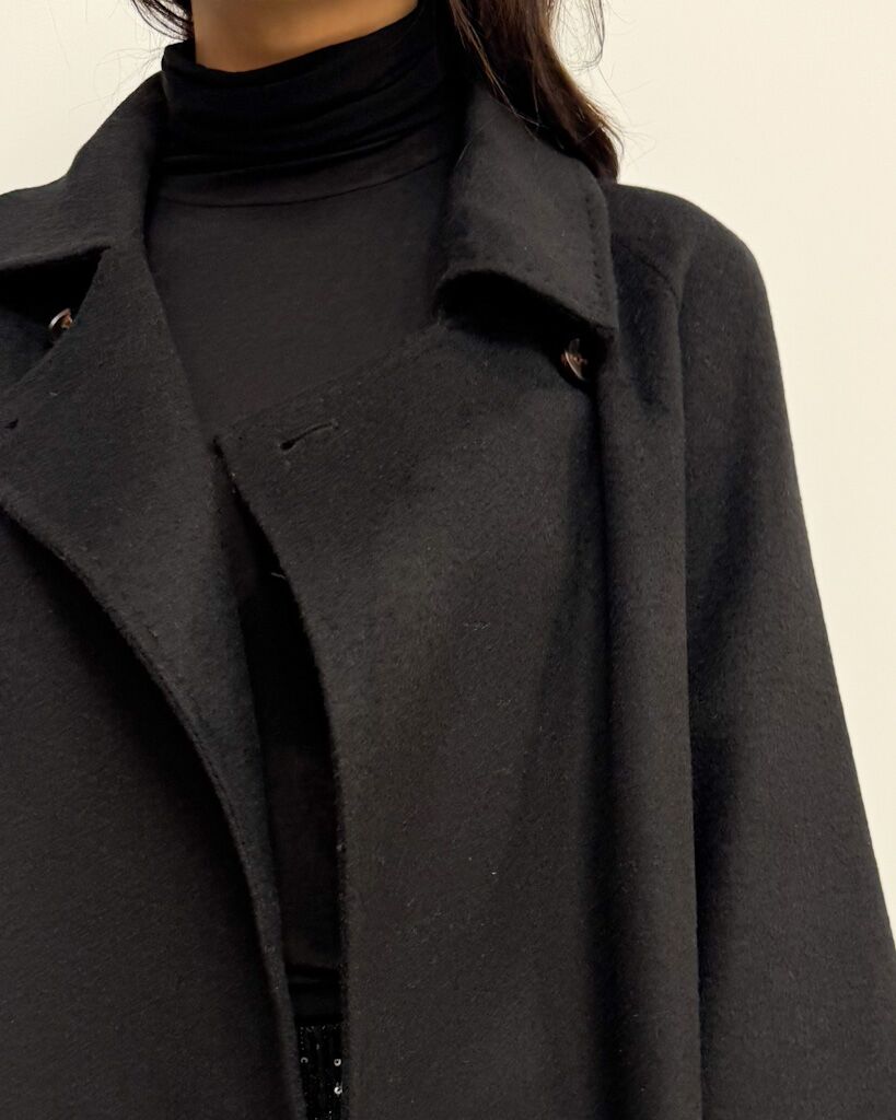 Czarny, klasyczny płaszcz damski z 50% wełny i wiązaniem w pasie. Stylowy, ciepły, elegancki – idealny wybór na wiele sezonów od marki Artigli.
