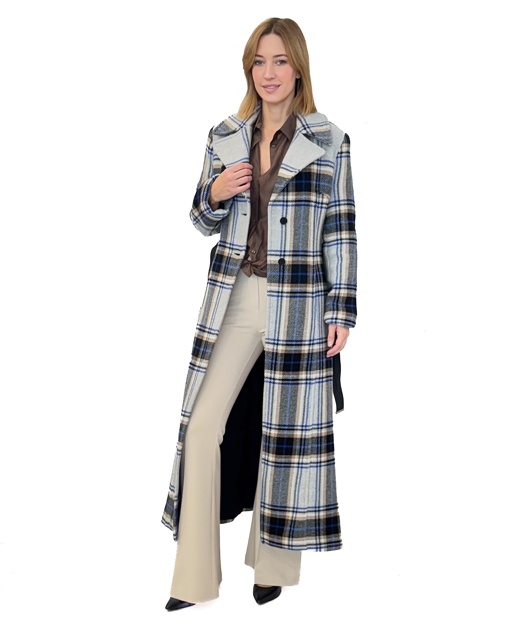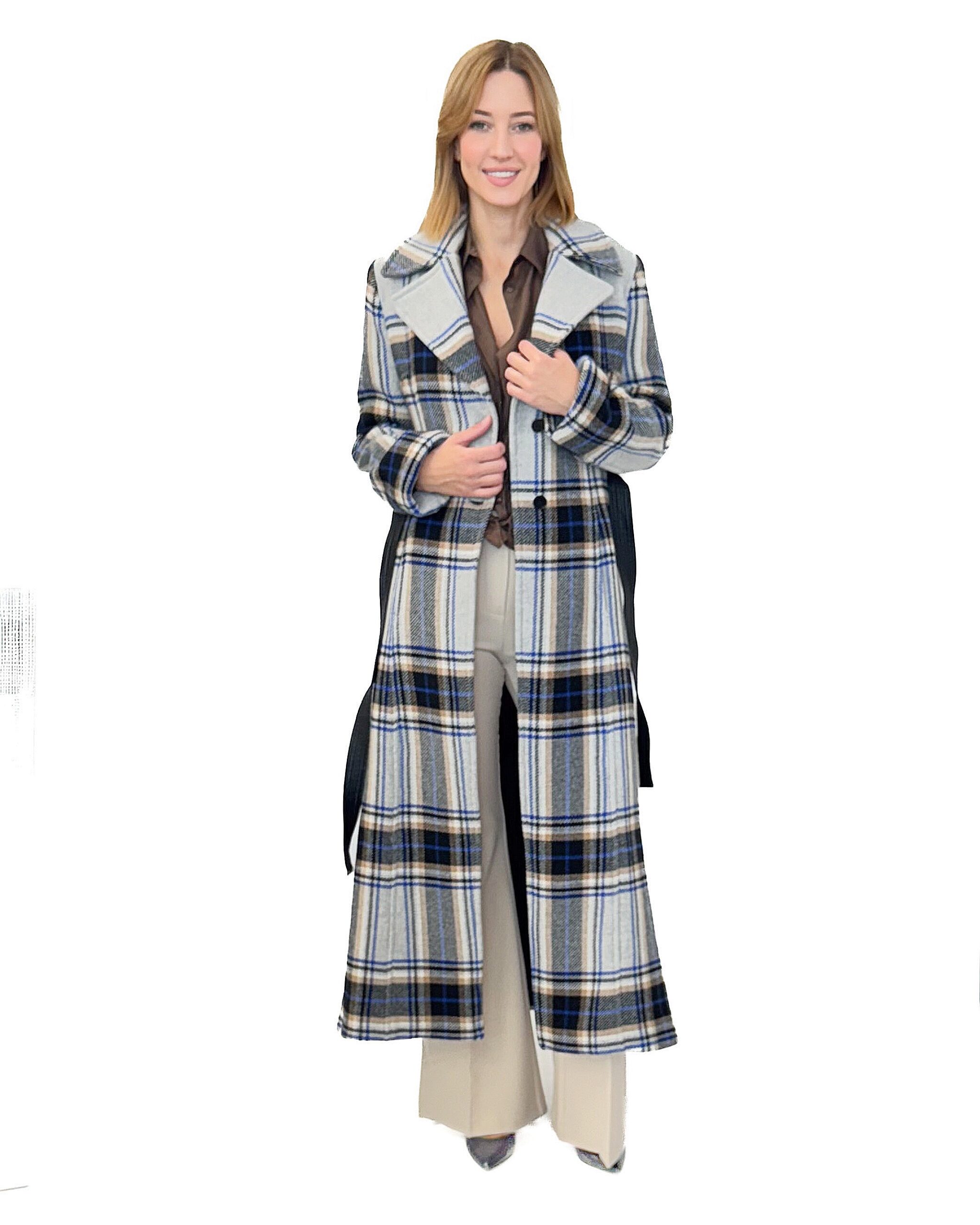 Długi płaszcz w kratę marki Pinko, taliowany, w szaro-niebieskim kolorze. Wiązany paskiem z eko skóry, zapinany na guziki – kobiecy i elegancki wybór.