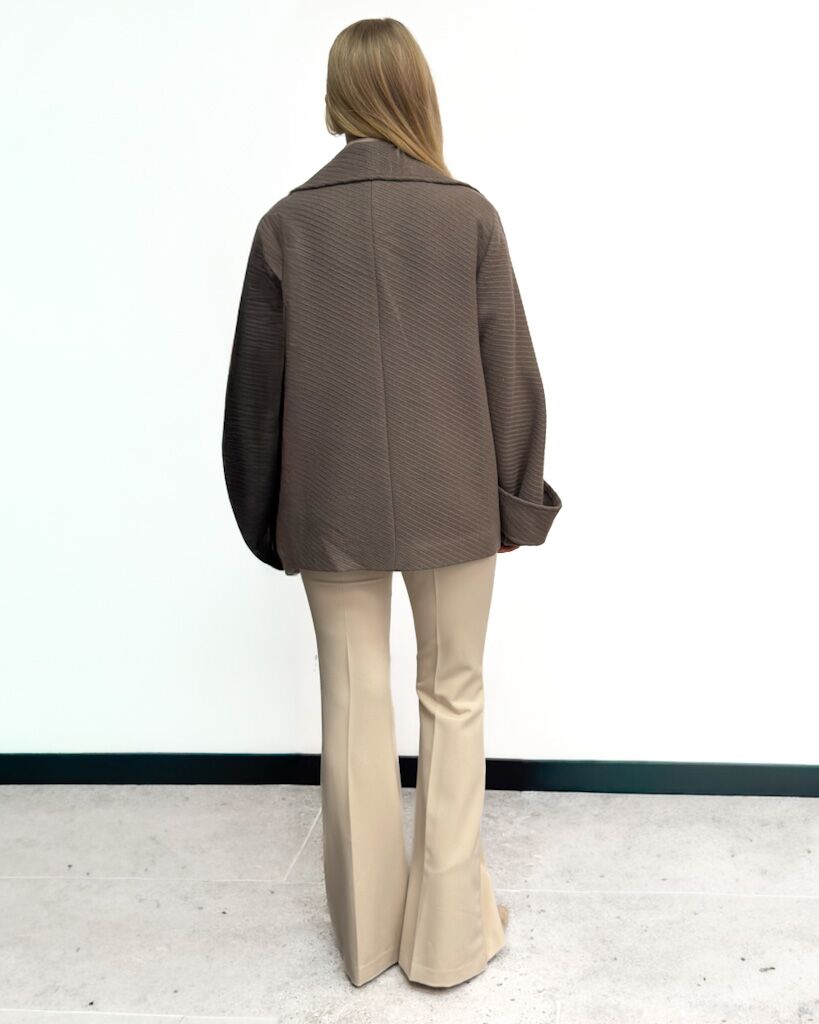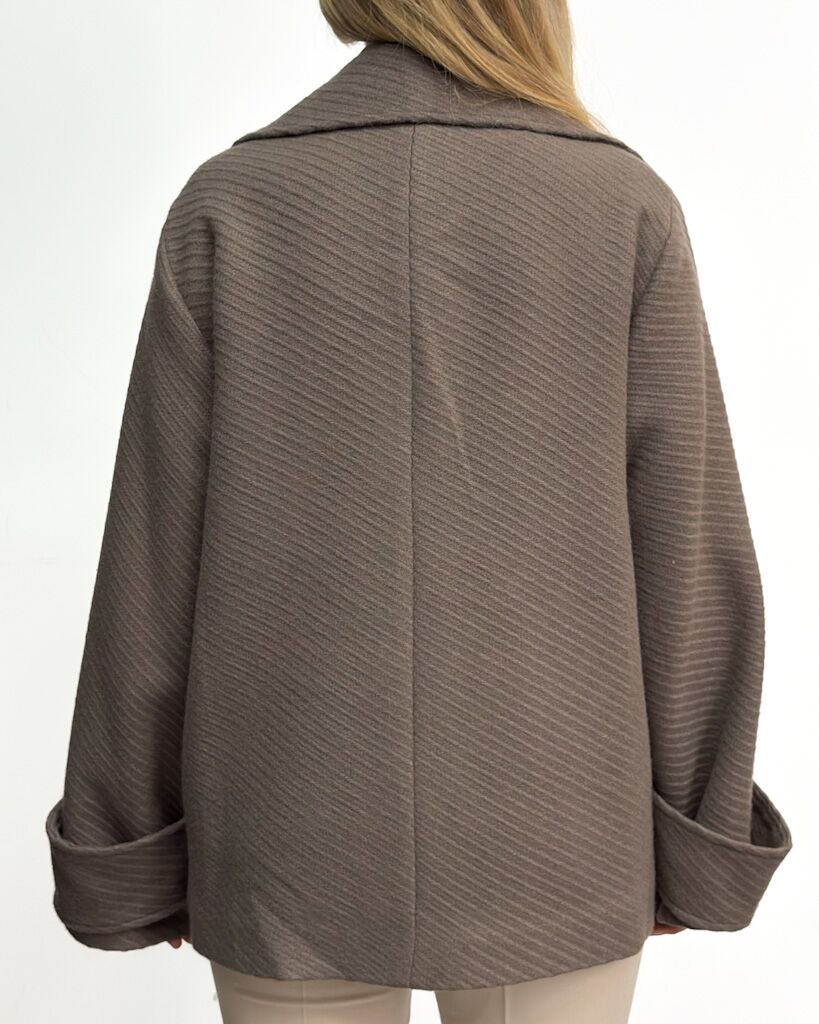 Stylowy, krótki płaszcz damski w odcieniu taupe to połączenie elegancji i wygody w najlepszym wydaniu. Wykonany z miękkiego, przyjemnego w dotyku materiału o delikatnej, prążkowanej strukturze, zapewnia komfort noszenia i idealne dopasowanie do sylwetki.