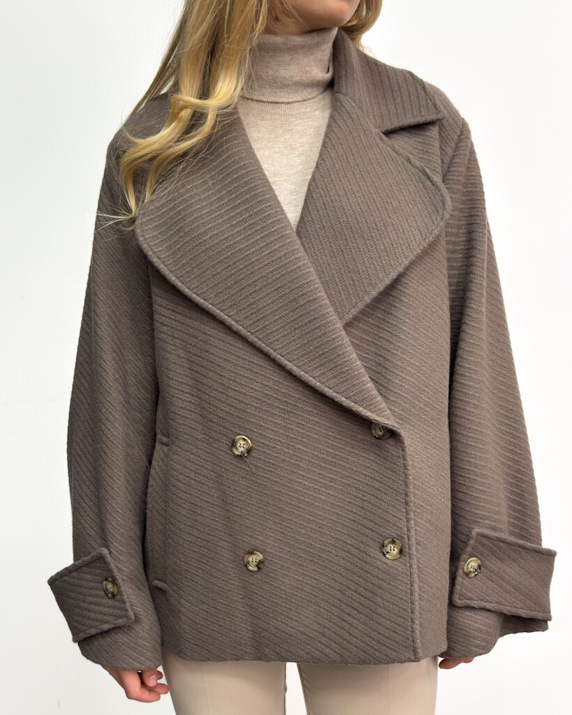Wygodny, krótki płaszcz damski w kolorze taupe od marki Pia B. Dwurzędowy fason z szerokim kołnierzem – elegancja, komfort i ponadczasowy styl w jednym.