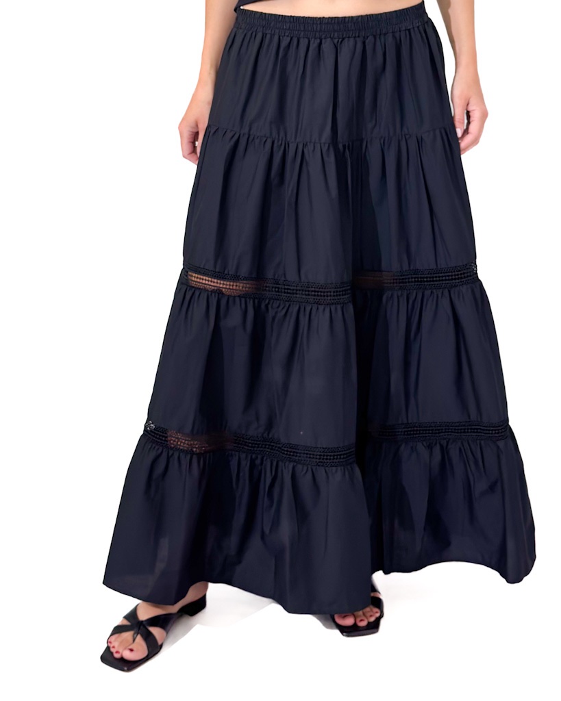Długa, czarna, letnia spódnica damska z gumką w pasie i ozdobnymi haftami. Zwiewna, wygodna i stylowa – idealna na lato i codzienne stylizacje.