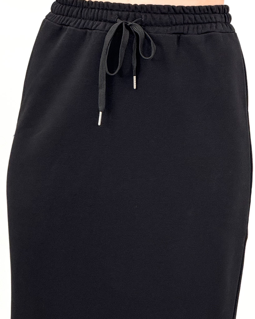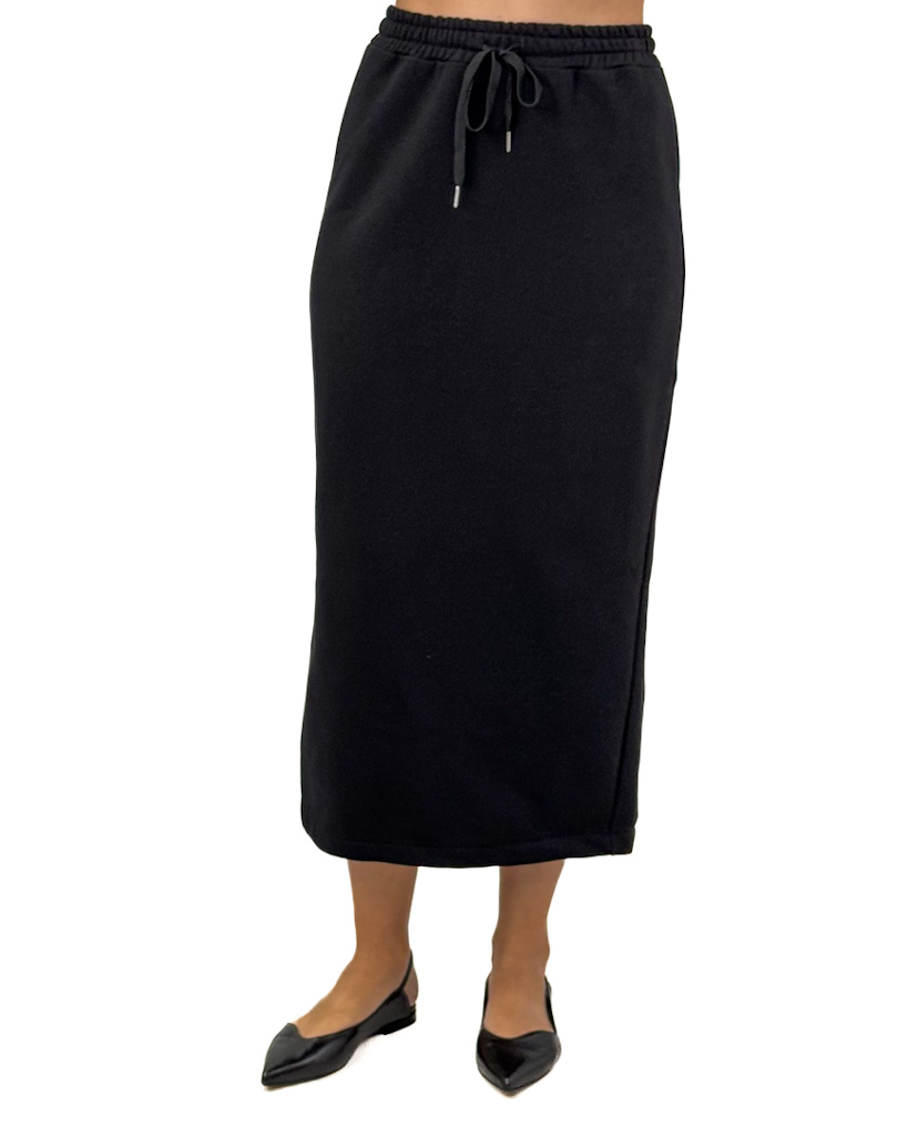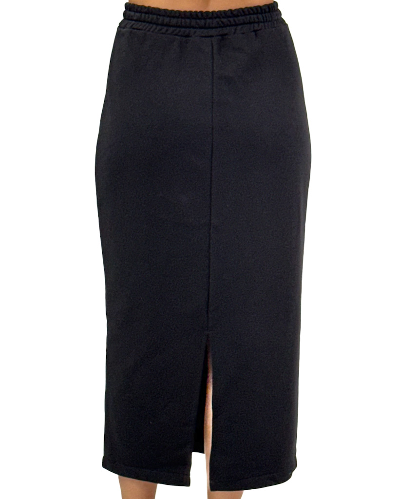 Czarna, dresowa spódnica midi z wygodnym wiązaniem w pasie i stylowym rozcięciem z tyłu. Komfort i modny design na co dzień i nie tylko.