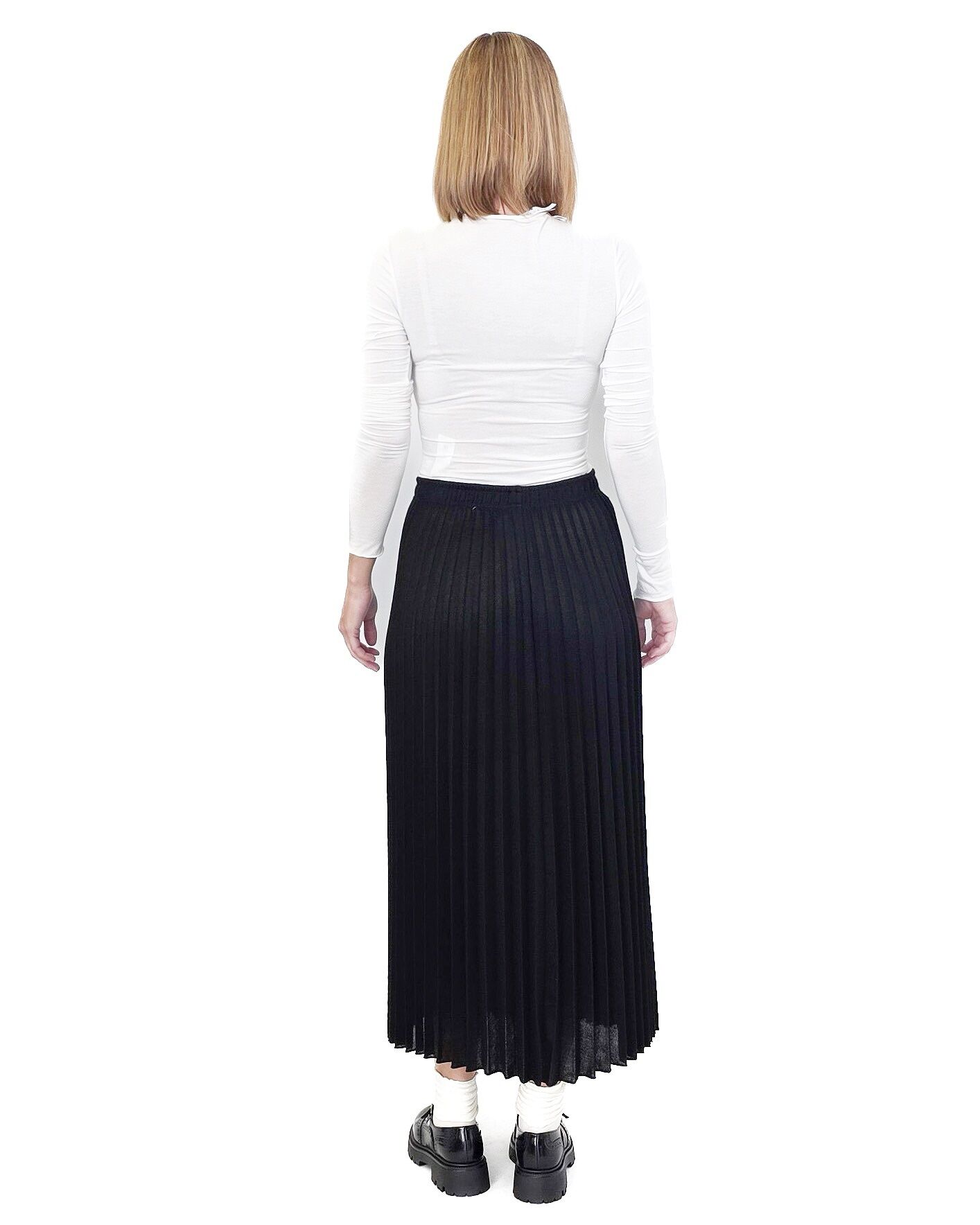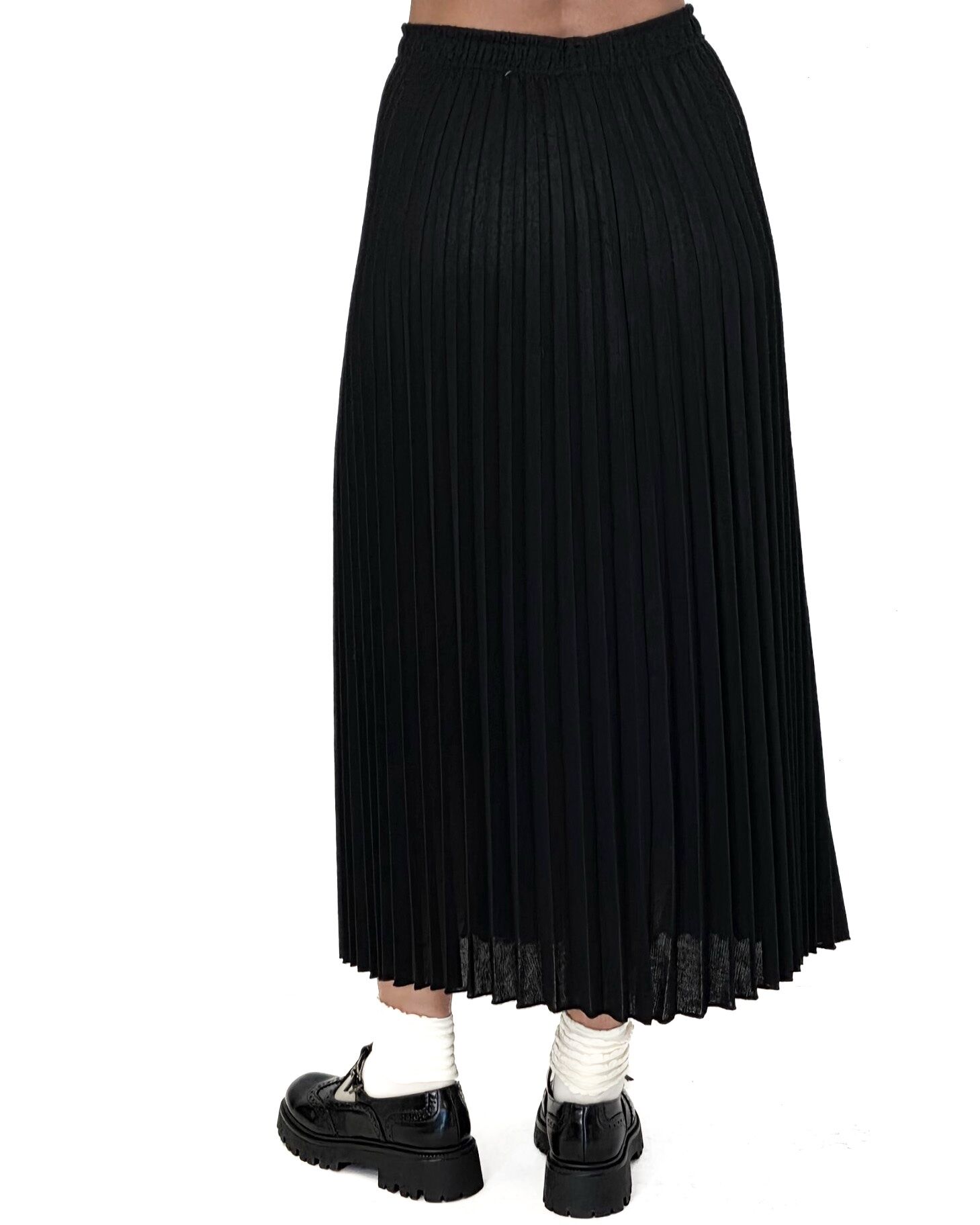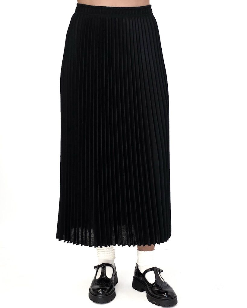 Czarna, plisowana spódnica midi z gumką w pasie. Klasyczna, wygodna i stylowa – idealna do eleganckich i codziennych stylizacji.