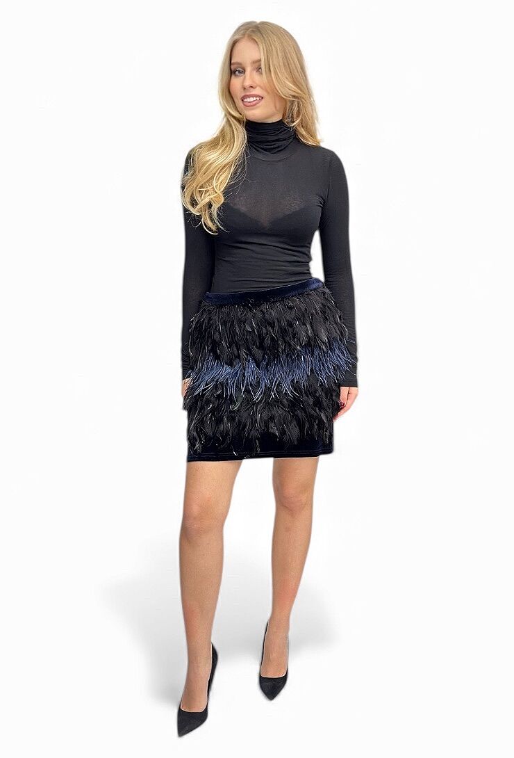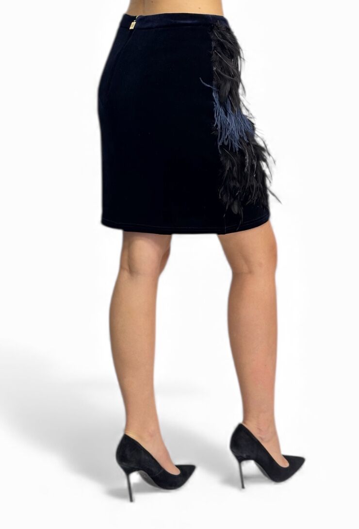 Ta wyjątkowa krótka, aksamitna spódnica z piórami to idealne połączenie elegancji, oryginalności i nowoczesnego designu. Wykonana z miękkiego, przyjemnego w dotyku aksamitu, który nadaje całości luksusowego charakteru oraz pięknie układa się na sylwetce. Głównym elementem dekoracyjnym są gęsto rozmieszczone pióra w odcieniach czerni i granatu, które tworzą efektowną, trójwymiarową strukturę oraz nadają stylizacji wieczorowego looku.