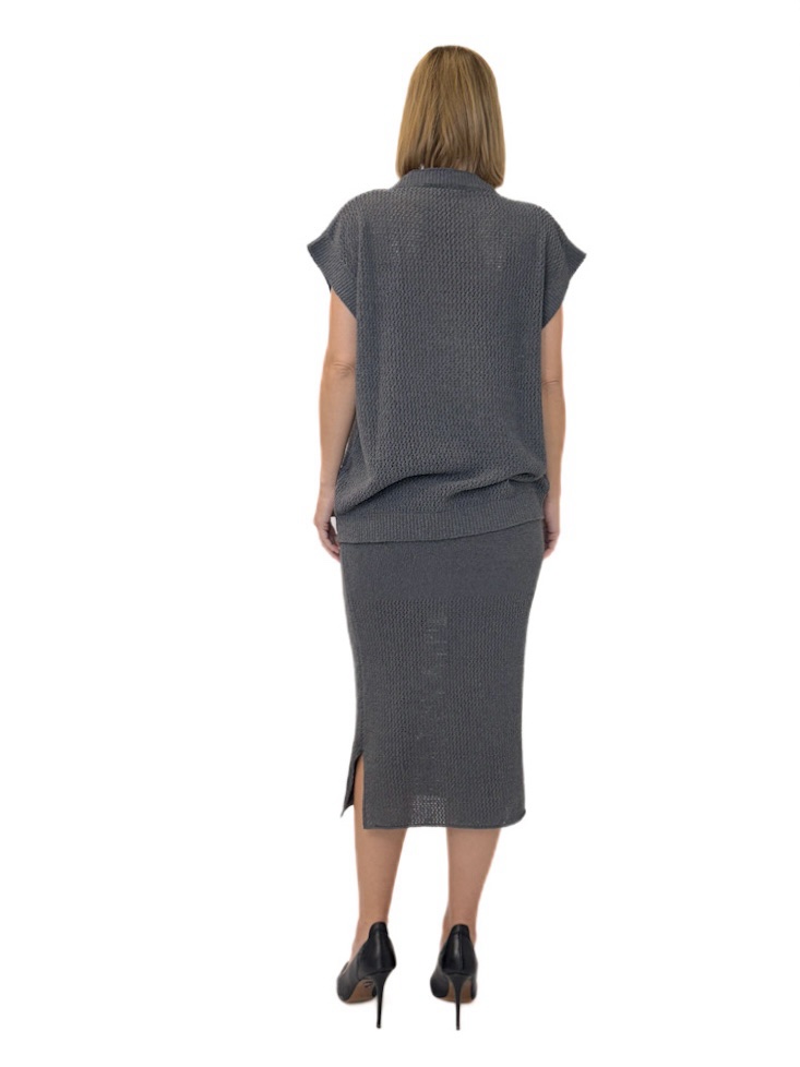 Opis: Dopasowany ołówkowy fason, długość midi, rozcięcie po boku, dół wykonany z innej grubości splotu